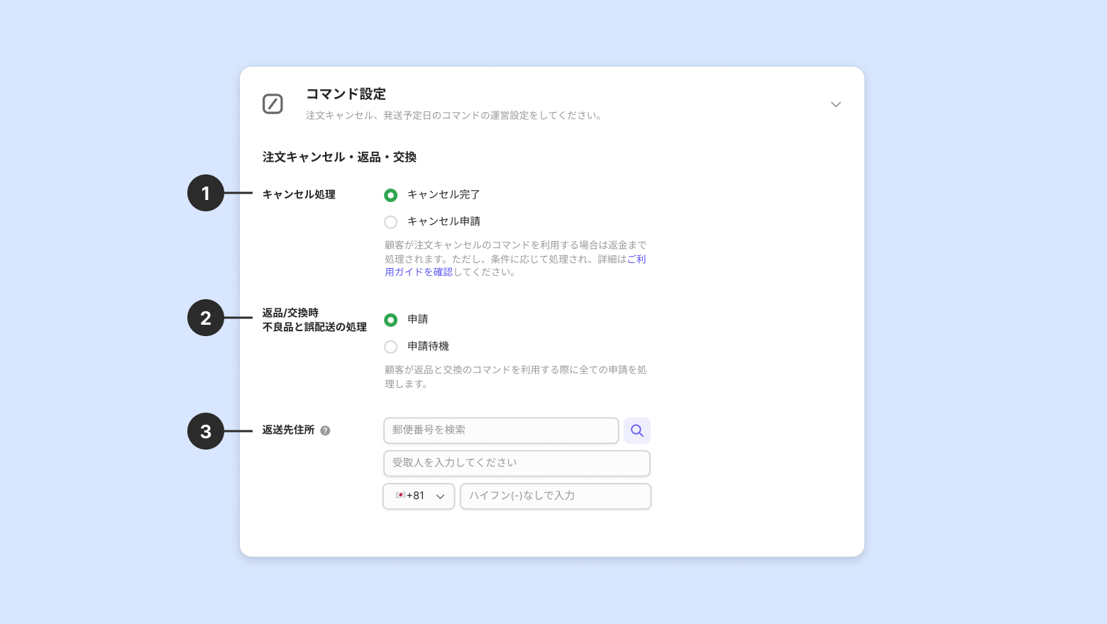 コマンド設定で注文キャンセルの処理方式を「キャンセル申請」にて選択したのに返金までされてしまいました。Cafe24のアドミンで [ショップ設定] - [注文設定] - [注文設定(注文後)] - [キャンセル/交換/返品の設定] 内の「キャンセル/交換/返品の申し込み設定」を「使用する」に設定し、「キャンセル受付時の返金自動処理」の値を設定していた場合、チャネルトークのコマンド設定から「キャンセル申請」を設定していても「キャンセル完了」で動作します。チェックを外すとキャンセル申請が作動します。