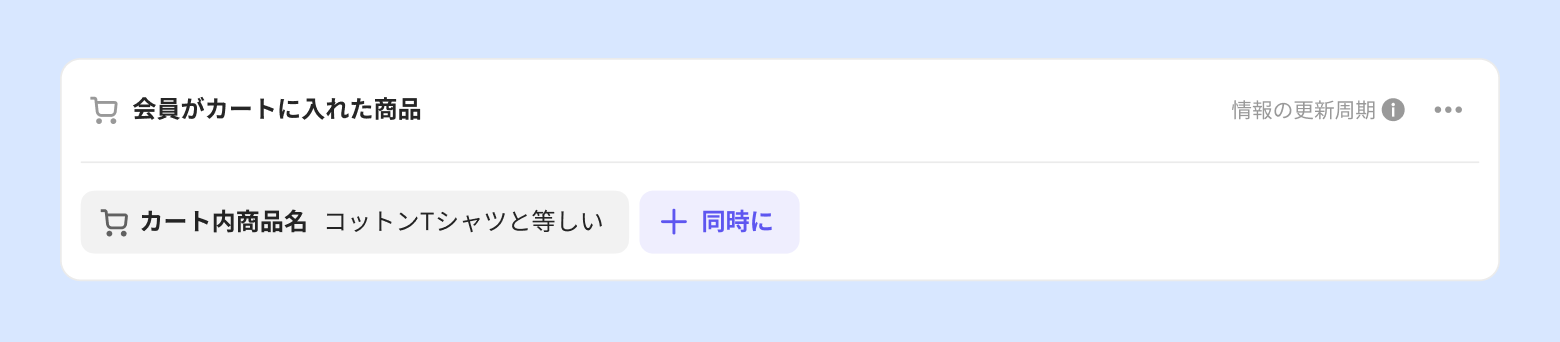 会員がカートに入れた商品、数量、合計金額を基準に、細かい条件を設定できます。[活用例] ・カートに特定の商品Aが入っている顧客に、その商品の割引クーポンを提供する
