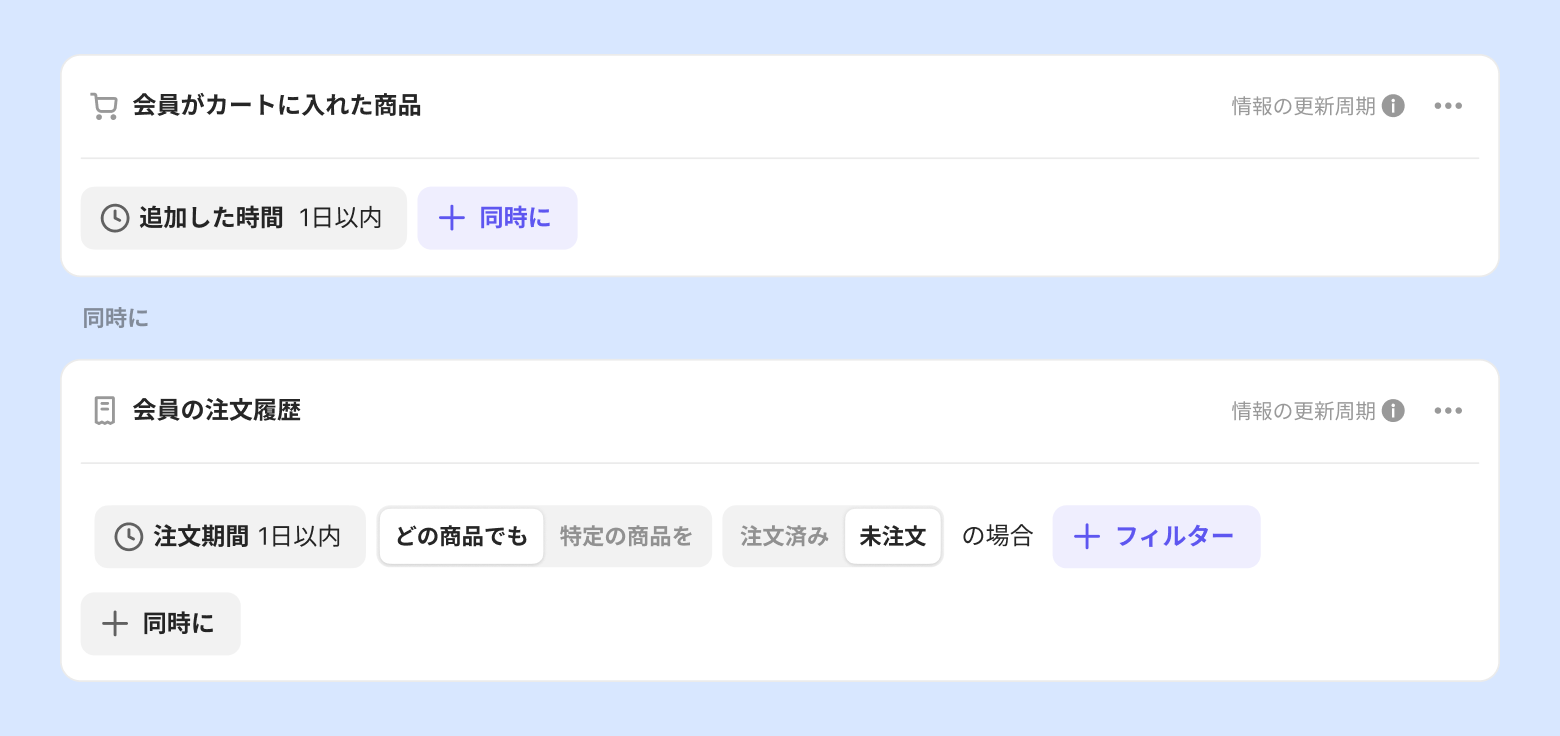 • 直近30日以内に商品Aを購入し、商品Bを購入していない顧客に関連商品の購入を促す