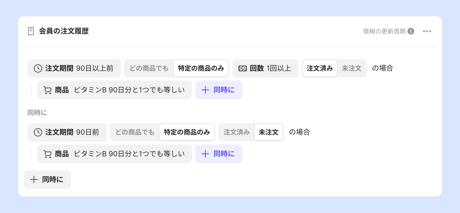 • 特定の商品Aを購入してから90日が経過し、その間に商品Aを再購入していない顧客に再購入を促す