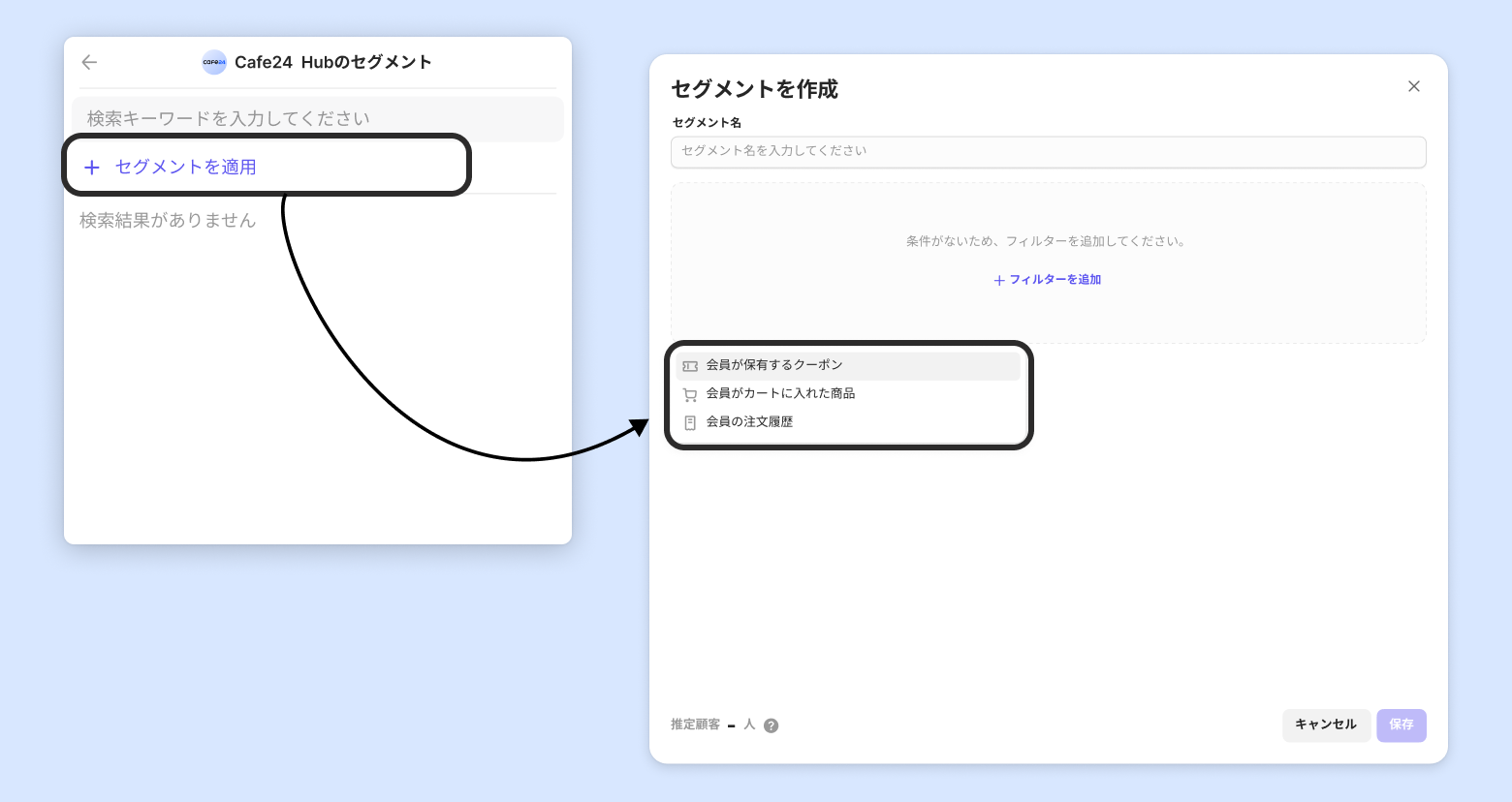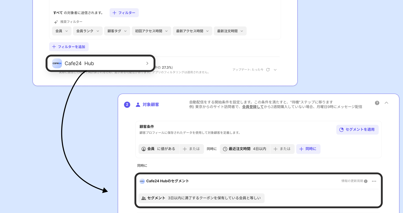 アプリセグメントを活用することで、Cafe24顧客の注文履歴・カート情報・クーポン情報を基盤にマーケティングの配信対象を細かく設定できます。