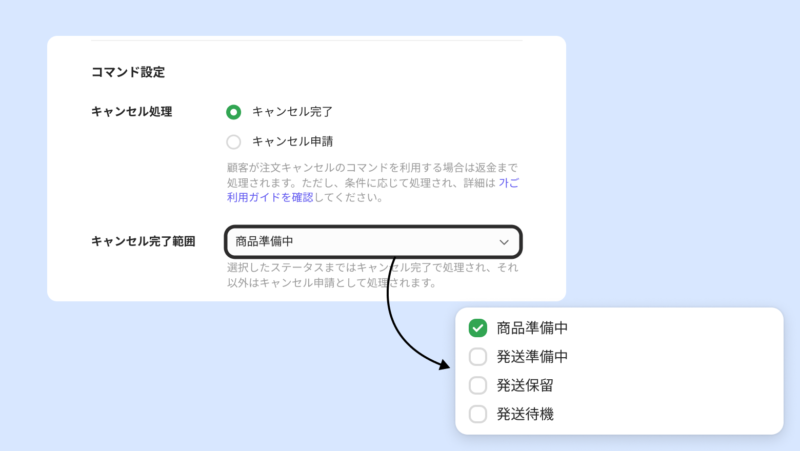 1. 該当設定内容「キャンセル時(入金前)」または「キャンセル時(入金後)」が“数量復旧の有無を確認” に設定されている場合、コマンドはキャンセル完了ではなく キャンセル申請 として処理されます。