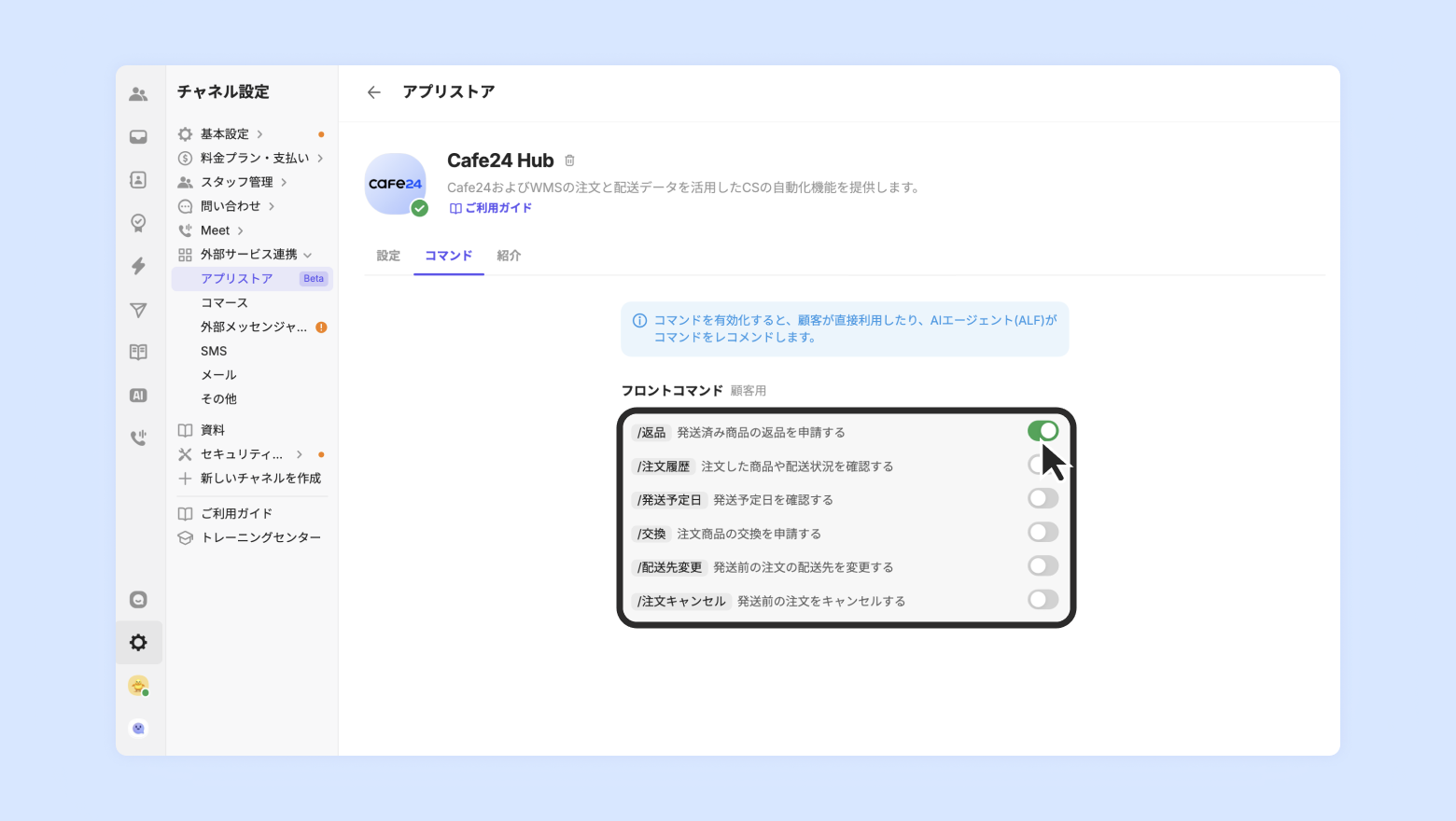 コマンドは、Cafe24のショッピングモールデータとWMS(物流管理システム)の在庫データをチャネルトークと連携し、顧客に注文情報(注文キャンセル、注文一覧、発送予定日など)を提供する機能です。この機能により、オペレーターは注文に関する単純な問い合わせ対応を減らすことができ、顧客も自分の注文内容を簡単に確認できるようになります。