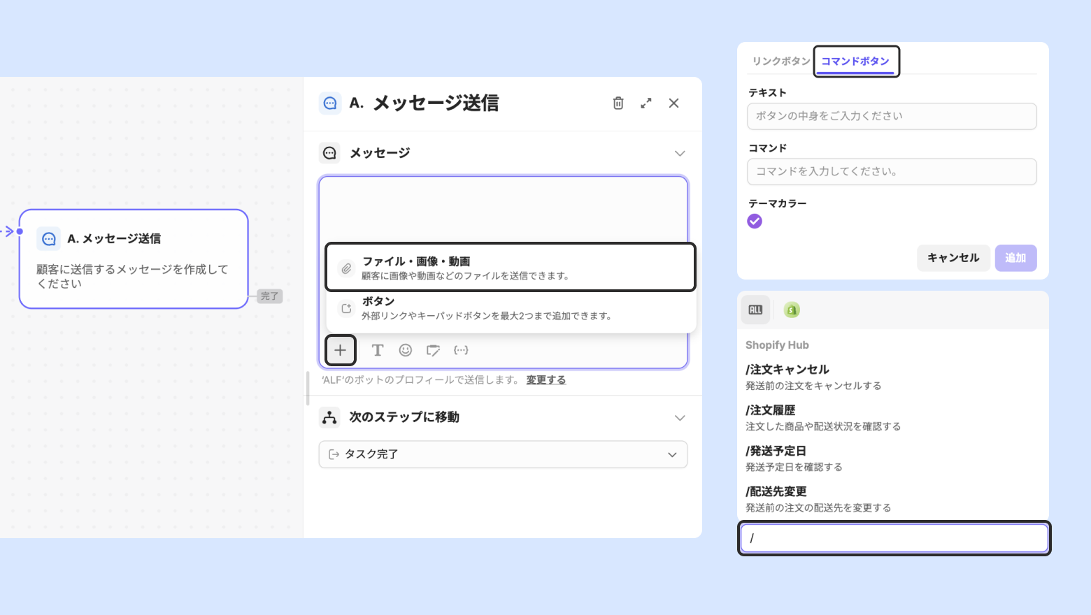 顧客が下記5つのコマンドのいずれかで処理できる質問をした場合、AIエージェントALFがコマンドボタン付きのタスクを実行できます。