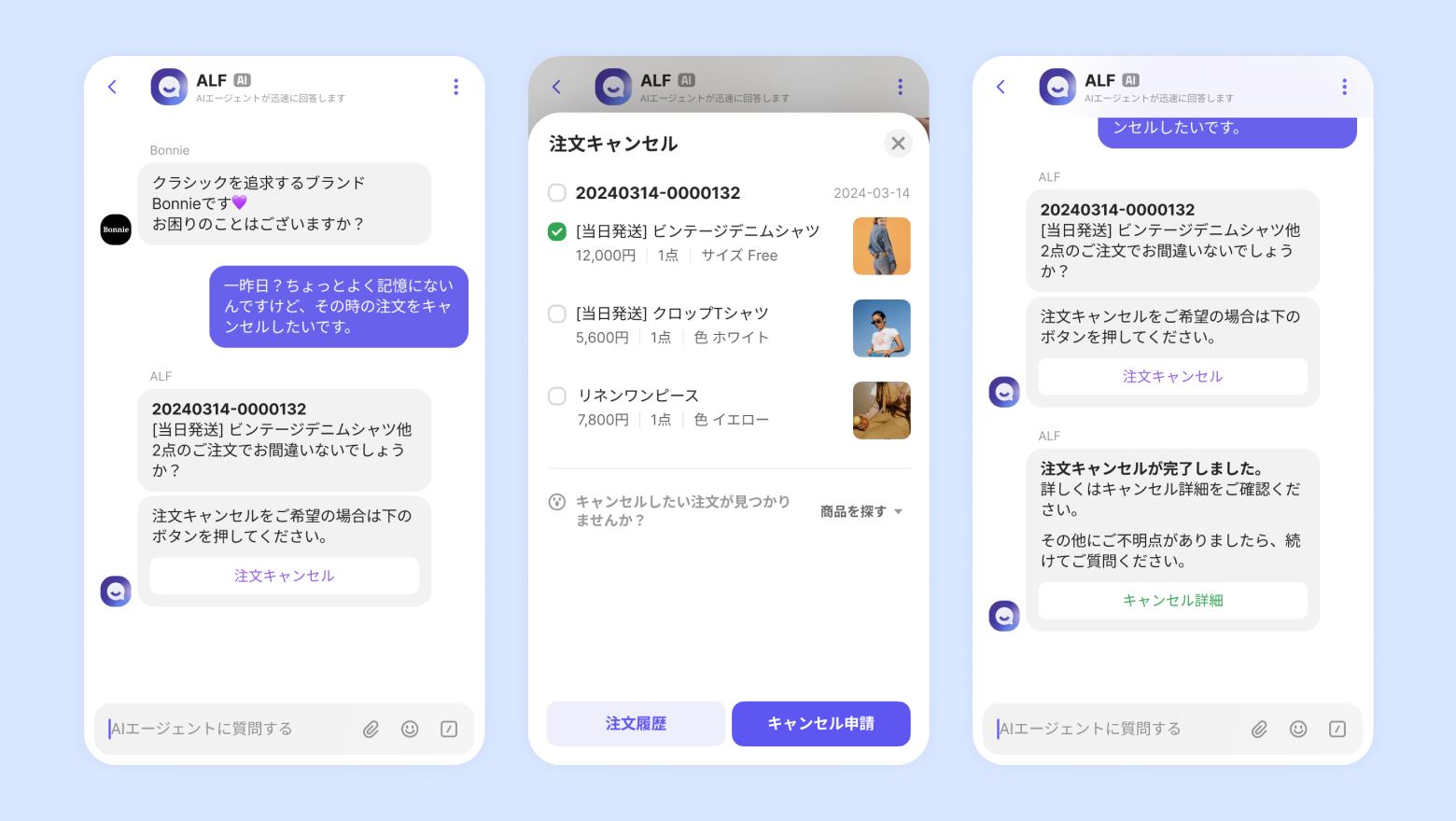 • 問い合わせ対応中に顧客が [注文照会] [注文キャンセル] を要請すると、ALFがタスクを自動的に実行し、会話形式で業務を処理します。