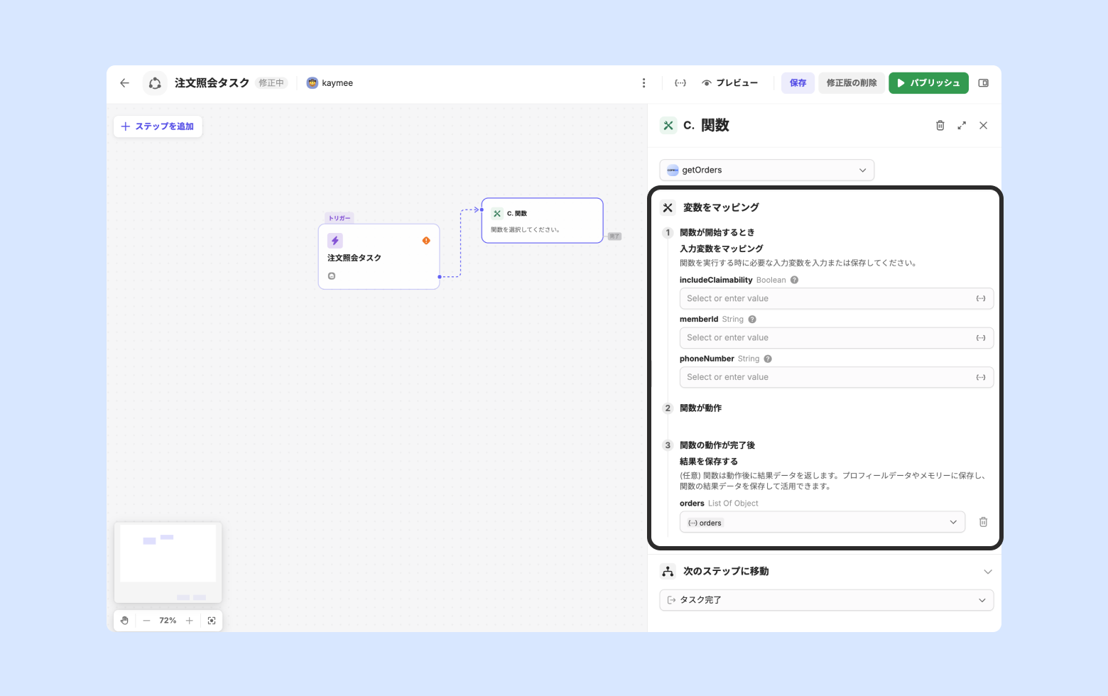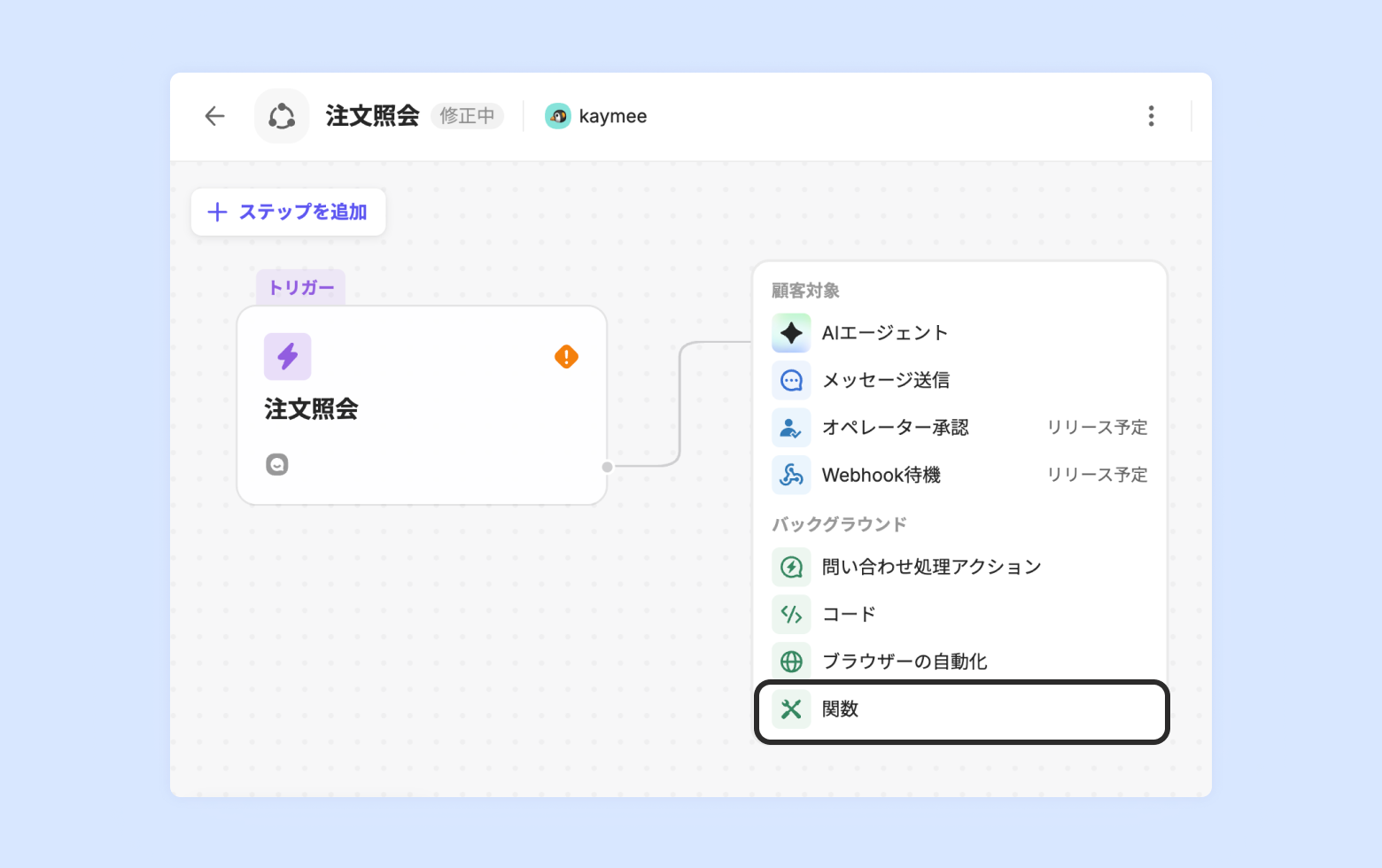 タスク設定画面で「関数」をクリックしてステップを追加します。