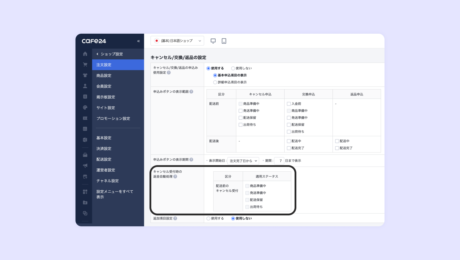 • Cafe24管理画面の [ショップ設定] - [注文設定] - [注文後の設定] - 購入者のキャンセル/交換/返品申請設定 の中で、「キャンセル/交換/返品申請」を 『使用する』 に設定し、さらに 「キャンセル受付時の自動返金処理」 にチェックが入っている場合、チャンネルトークのコマンド設定で「キャンセル申請」を選んでいても、処理は 「キャンセル完了」 として実行されます。