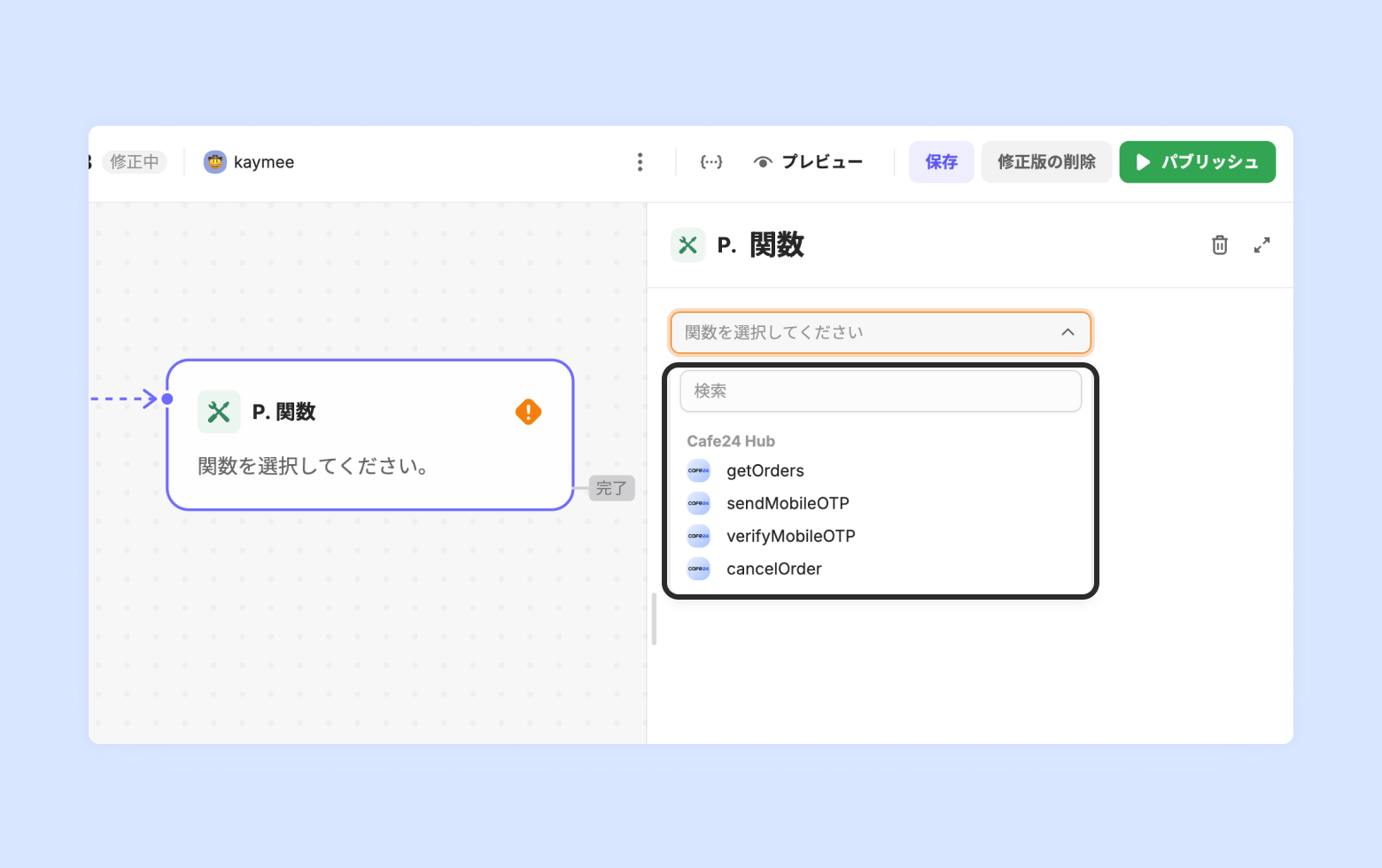 • [AIメニュー] - [設定] - [タスク] - [Cafe24 Hub] で [注文照会] または [注文キャンセル] タスク - 右端の︙ボタンをクリックし、[パブリッシュ] を押すと適用されます。