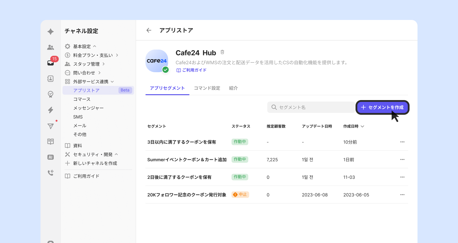 Cafe24 Hubは、アプリセグメント機能コマンド機能を提供します。