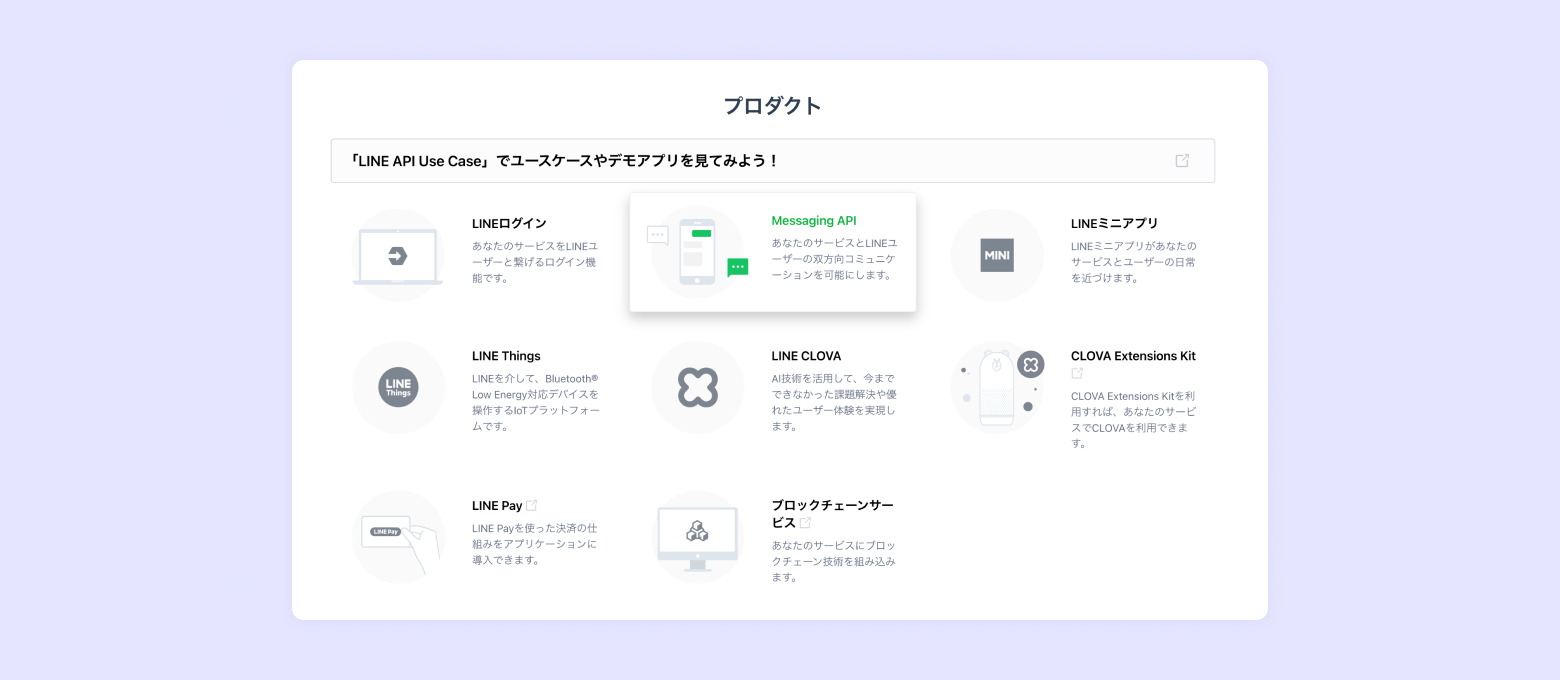 [Messaging API]を作成してください。1つのチャネルに1つLINEアカウントの連携が可能です。