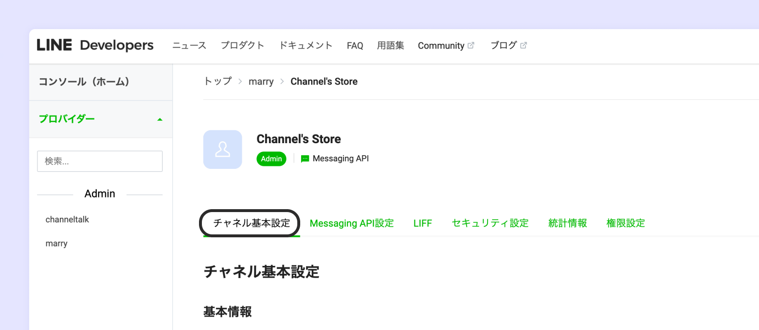 [チャネル基本設定] からLINEのChannel ID、Channel secretを確認してください。