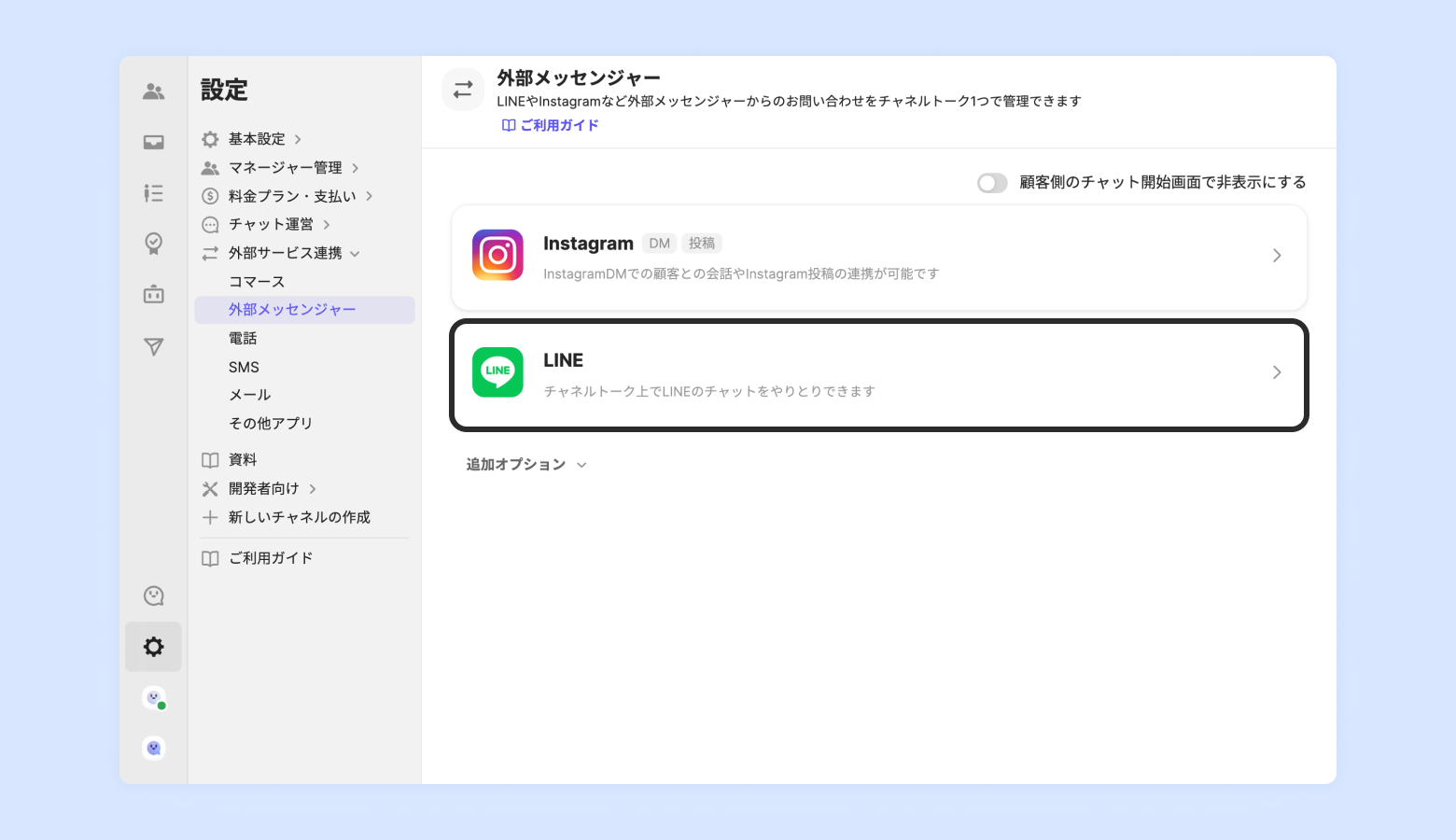 [チャネル設定]-[外部サービス連携]-[外部メッセンジャー]-[LINE]から[連携]をクリック