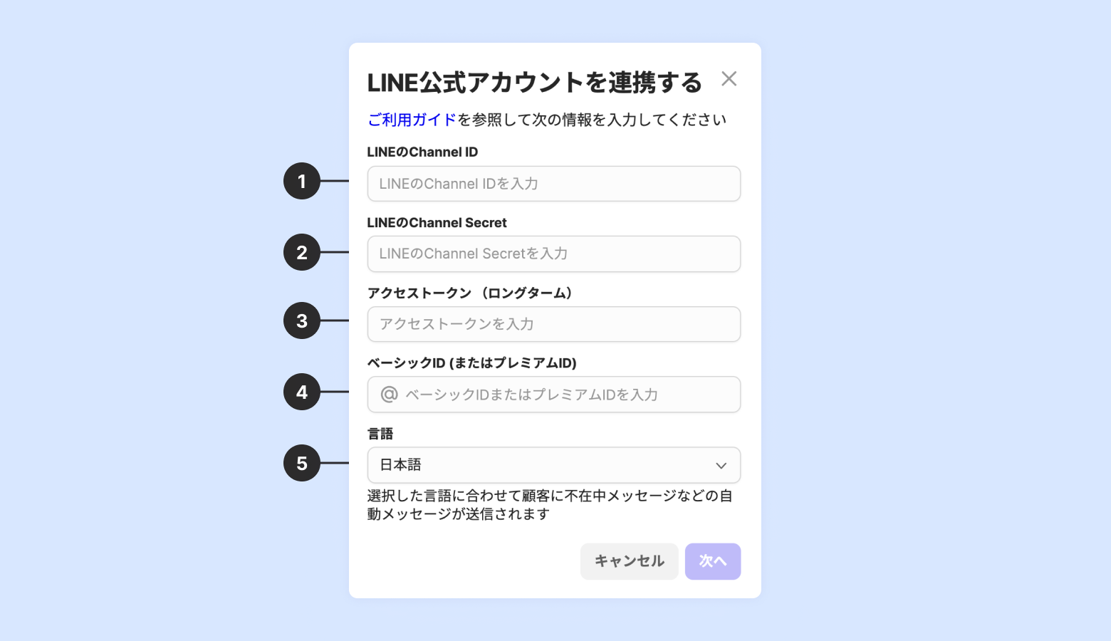 LINE Channelで確認した下記4つの情報を入力