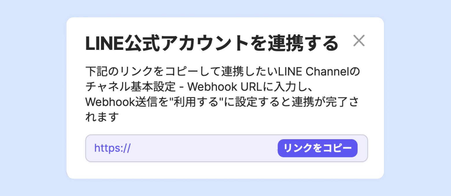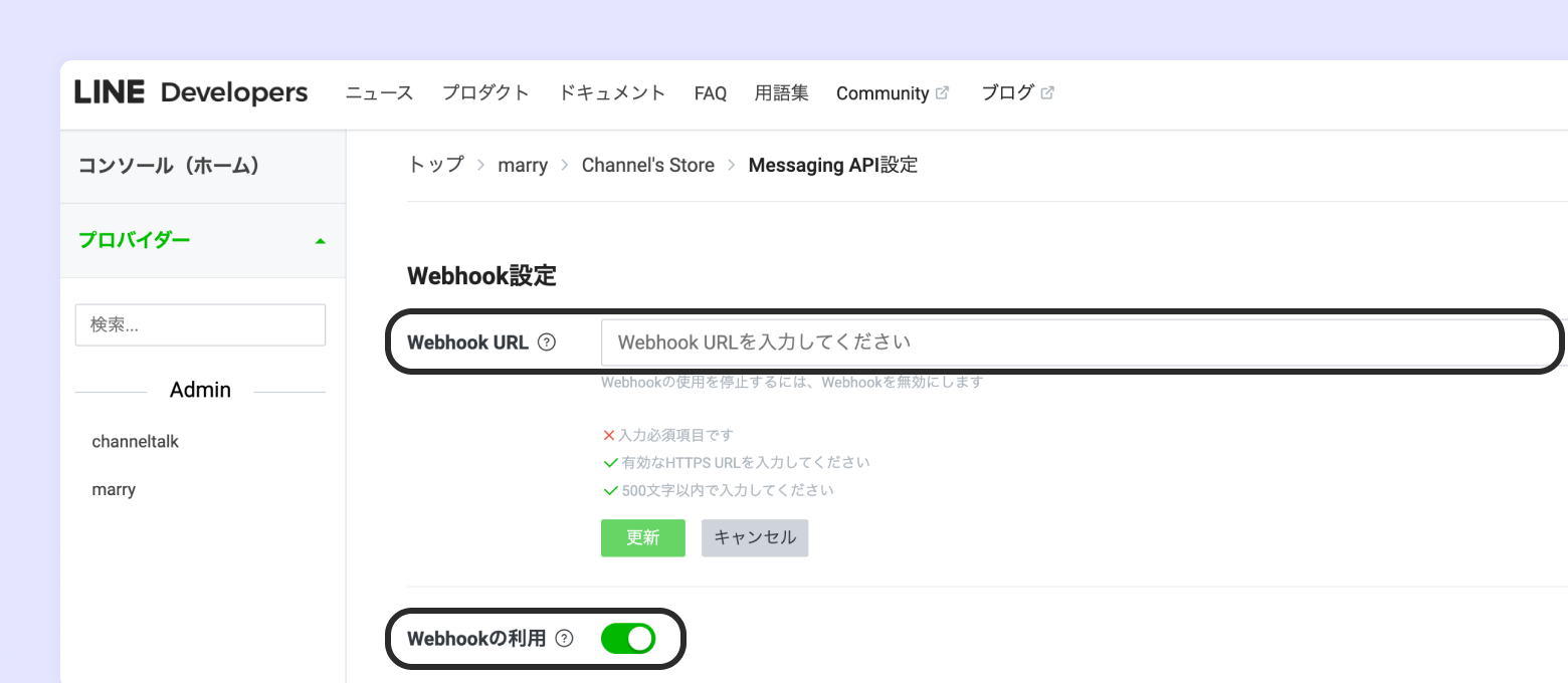 LINE Channelの Messaging API メニュータブの[Webhook設定]-[Webhook URL]にリンクを入力し、Webhookを有効化