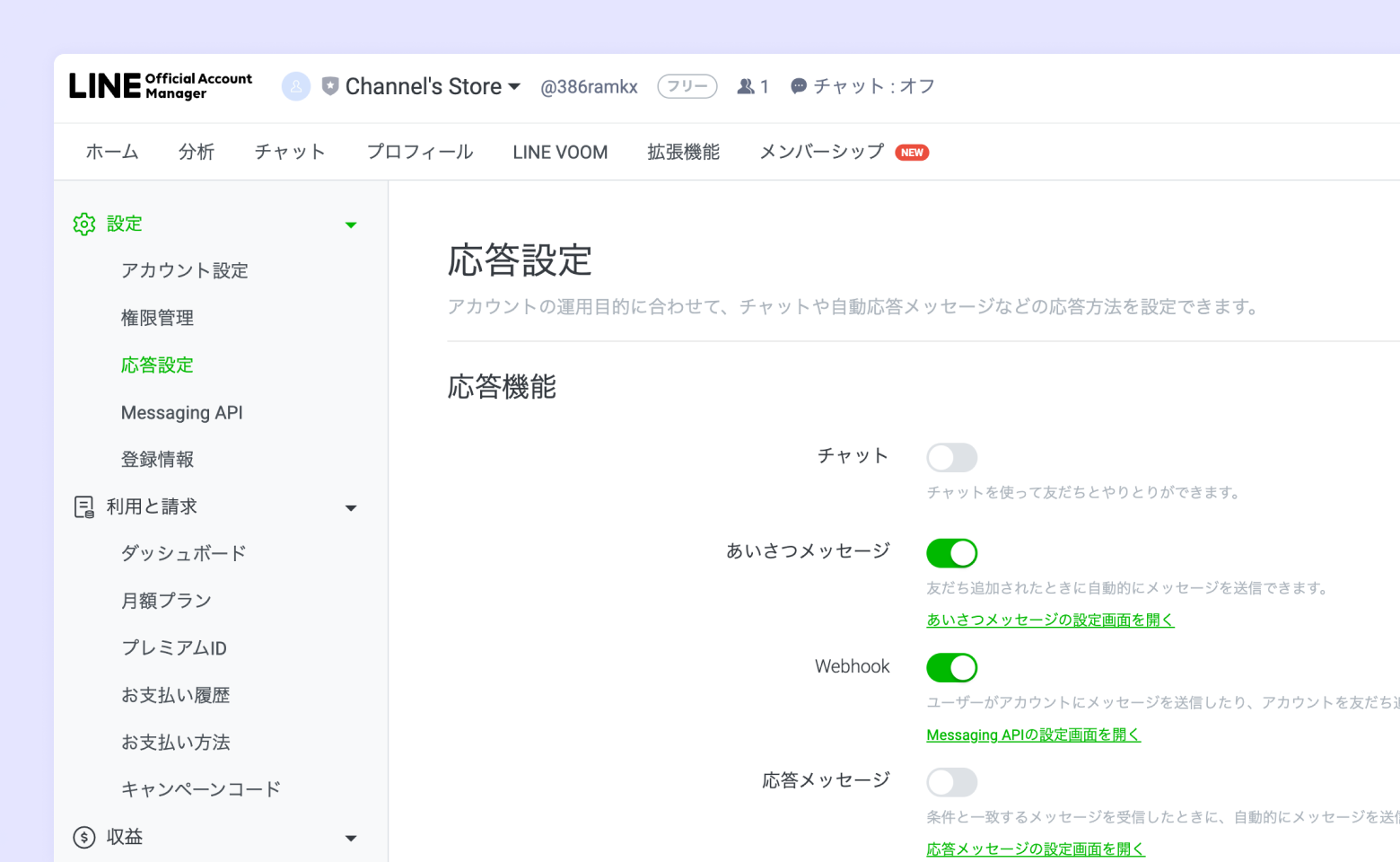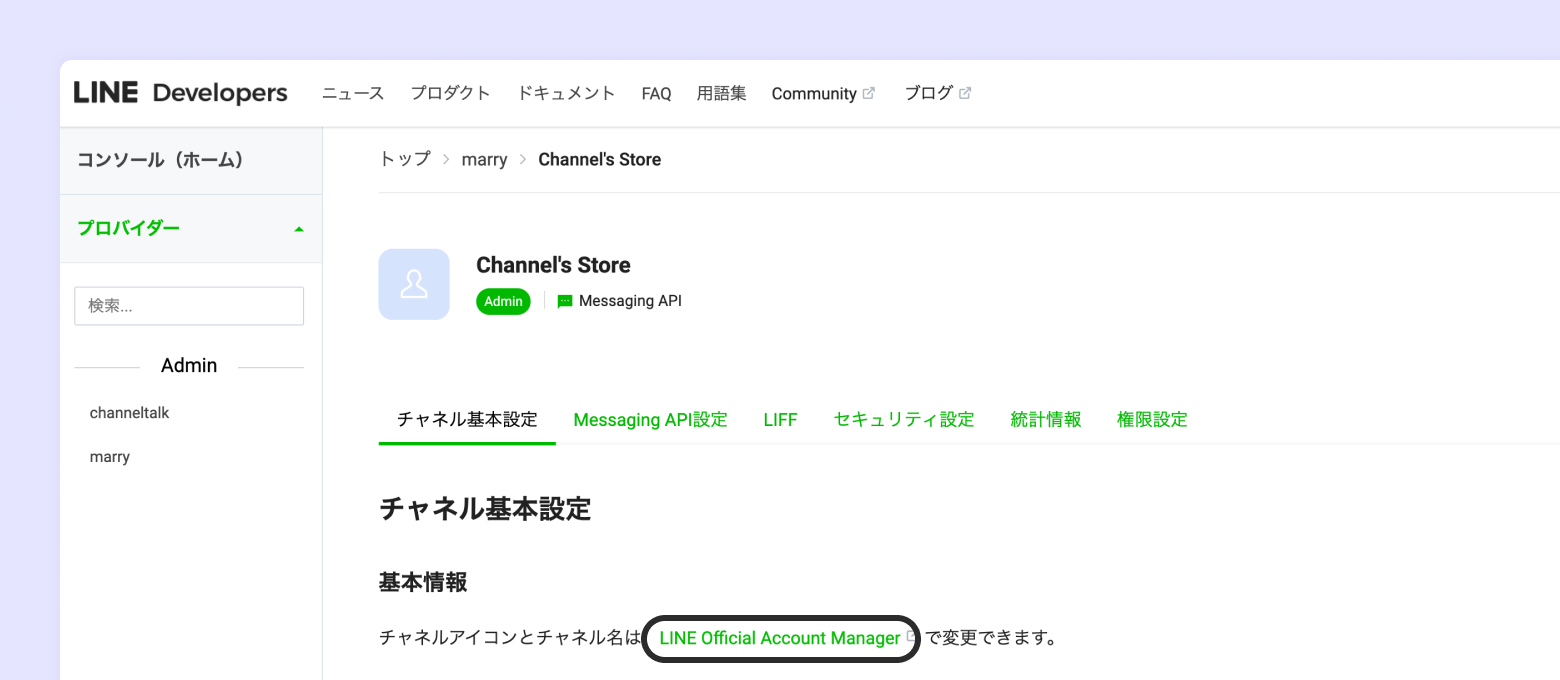 チャネル基本設定のメニュータブでLINE Official Account Managerをクリックしてアクセス