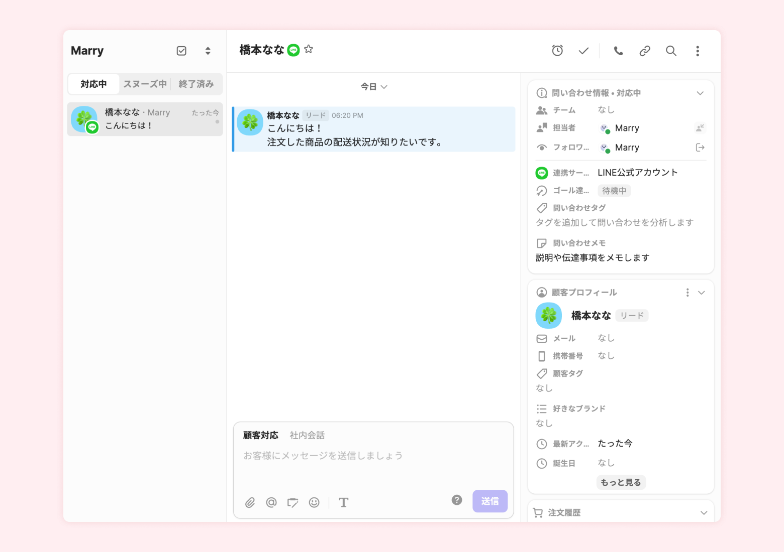 これで、LINEから流入してきた問い合わせにチャネルトーク上で返信できます。