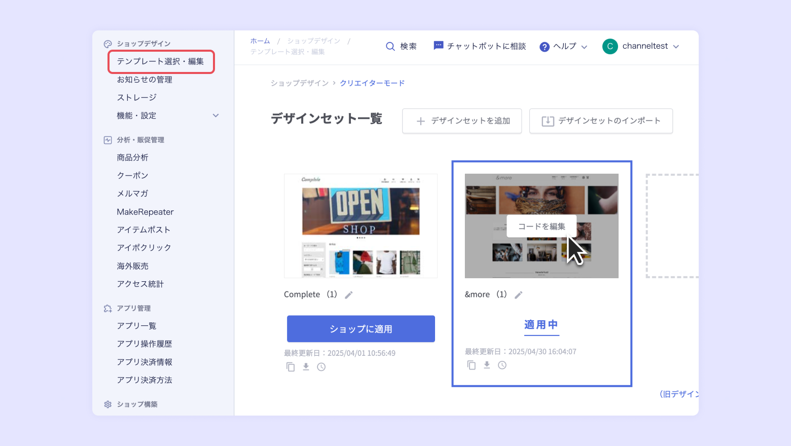 [ショップデザイン] - [テンプレート選択・編集] でチャネルトークを設置するテンプレートにマウスを当て、[コードを編集] をクリックします。
