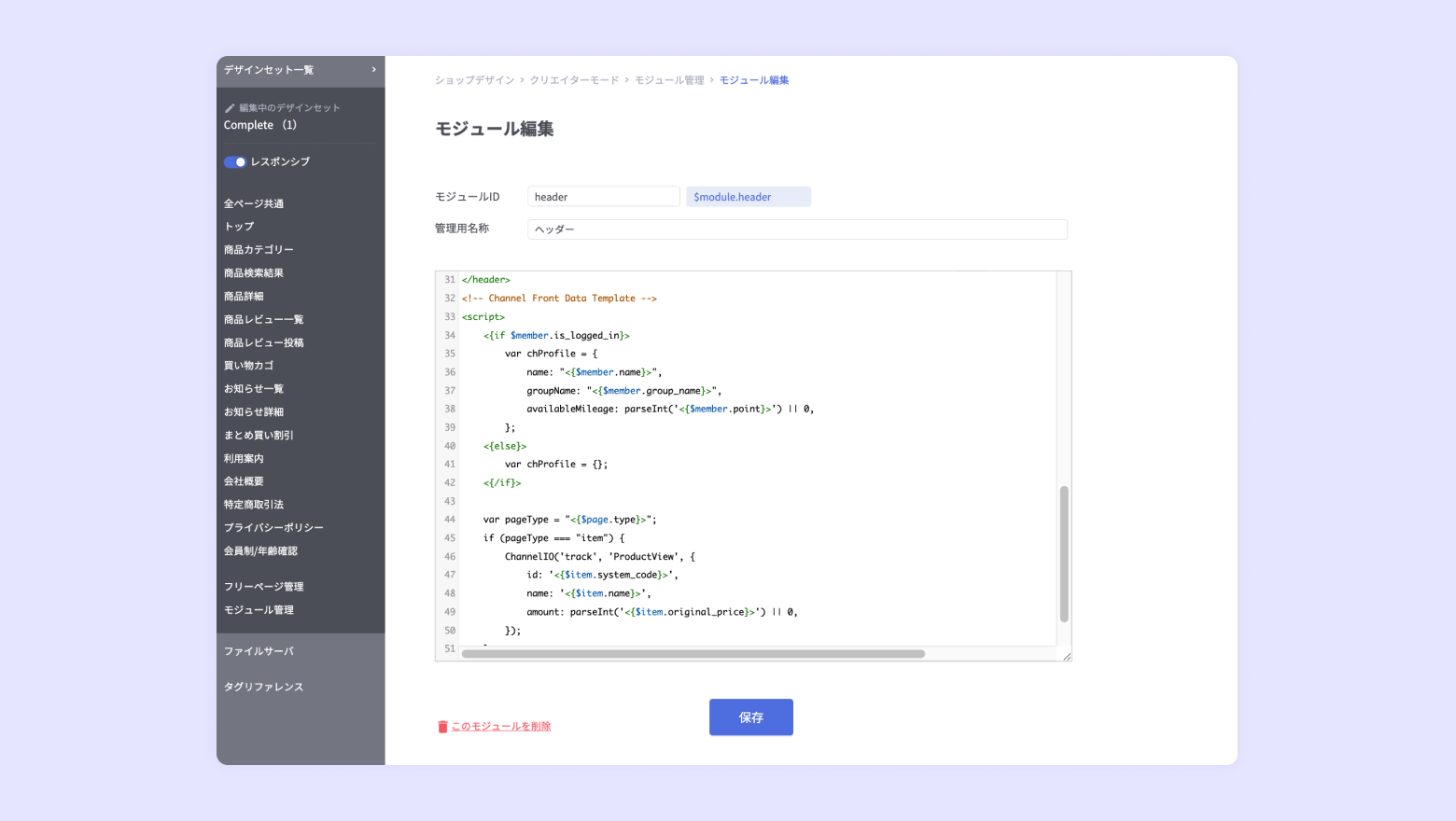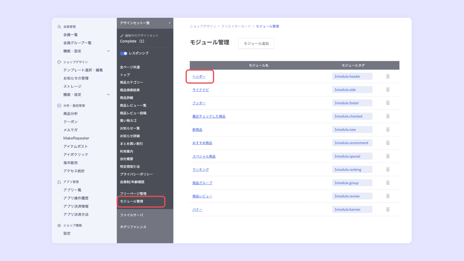 [モジュール管理] - [ヘッダー] を選択します。