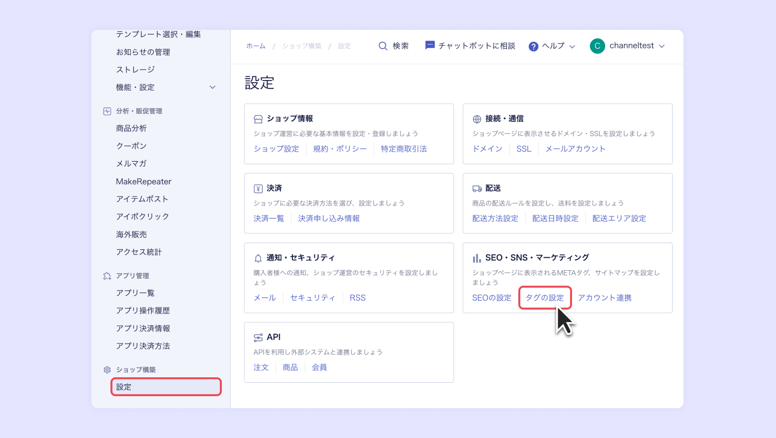 [設定] - [SEO・SNS・マーケティング] - [タグの設定] をクリックします。