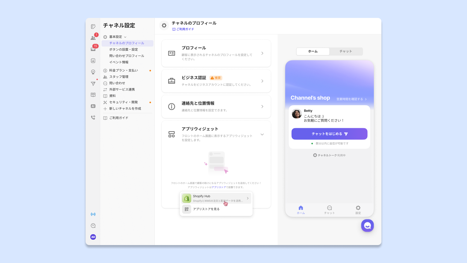 [チャネル設定] - [基本設定] - [チャネルのプロフィール] - [アプリウィジェット] で、アプリウィジェットを追加できます。顧客がチャネルトークのホーム画面でウィジェットを通してコマンドを実行できます。