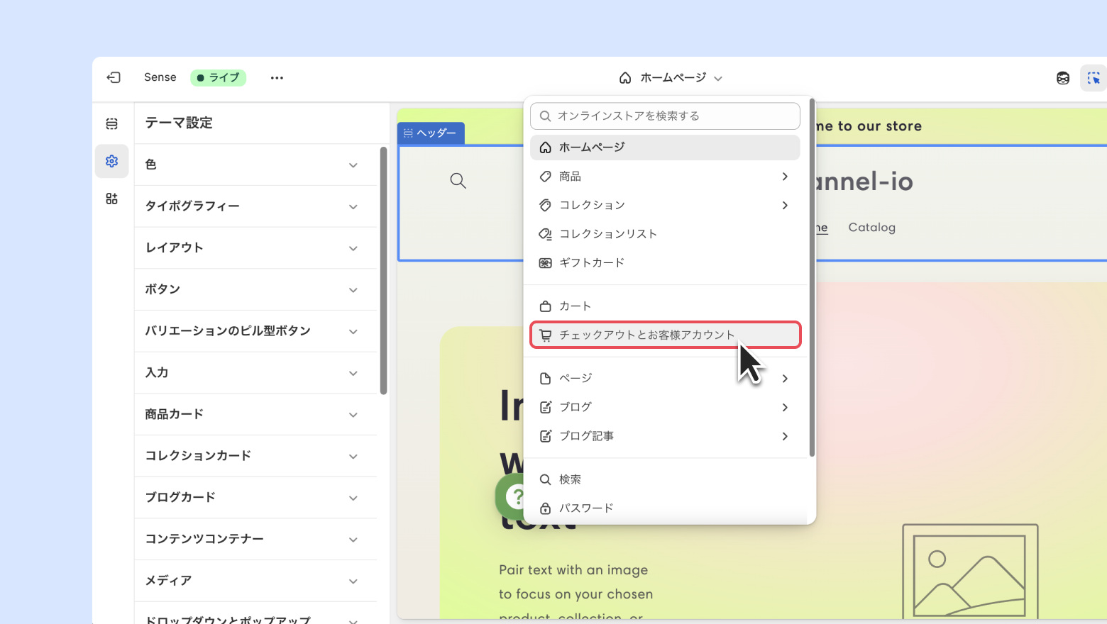 Shopify管理画面の [オンラインストア] - [テーマ] - [カスタマイズ] をクリックし、[チェックアウトとお客様アカウント] を選択します。