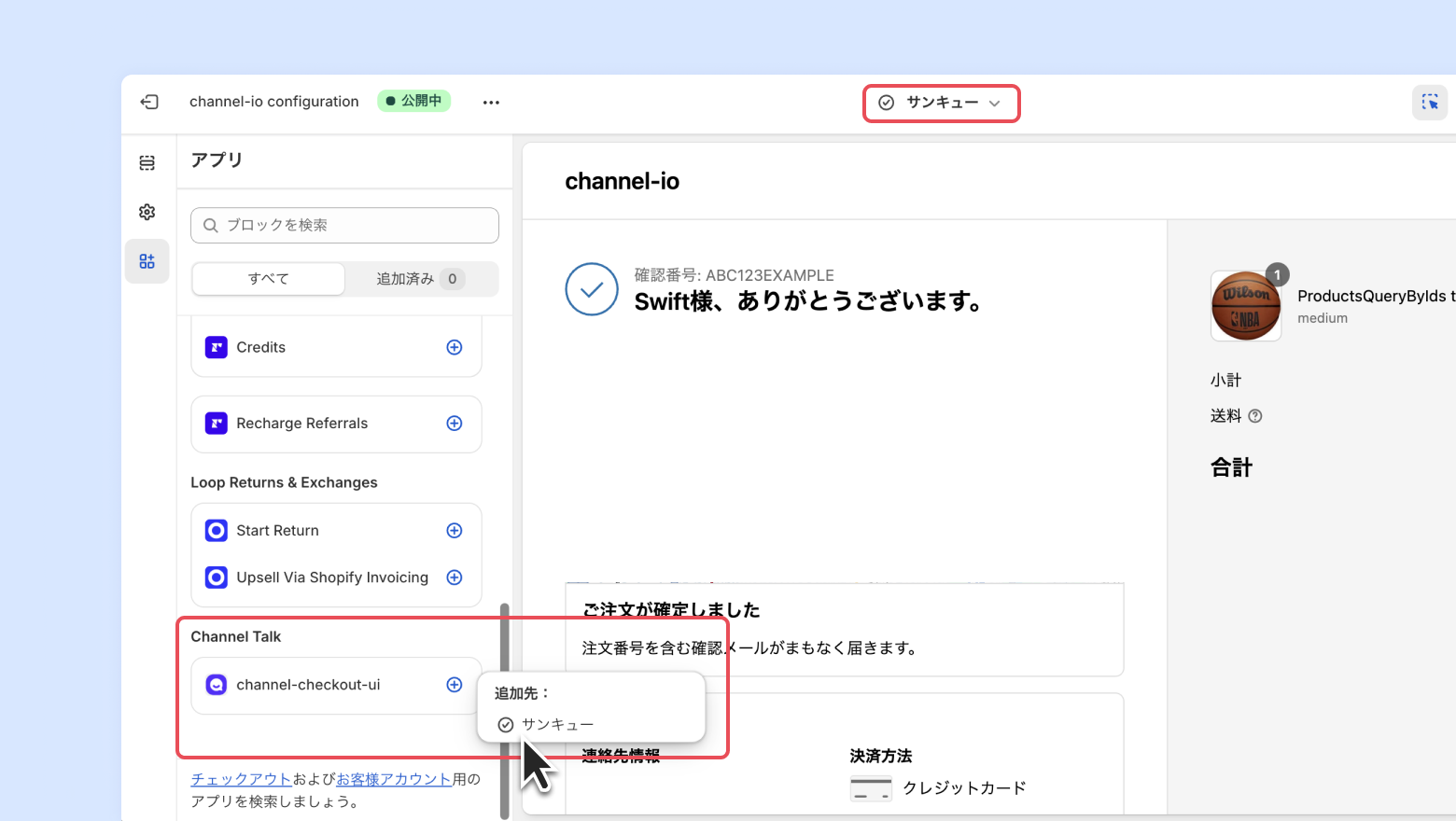 [サンキュー] ページの編集画面の埋め込みアプリで、[channel-checkout-ui] - [サンキュー] にチェックをして、画面右上の [保存] を押すとページに反映されます。