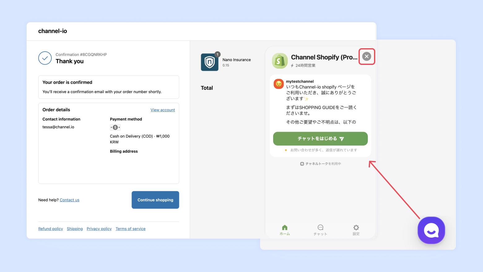 また、他のページと異なり、チャットウィンドウを閉じる際の❌ボタンはチャット右上に表示されます。(→ShopifyのチャットUIコンポーネントを確認する)