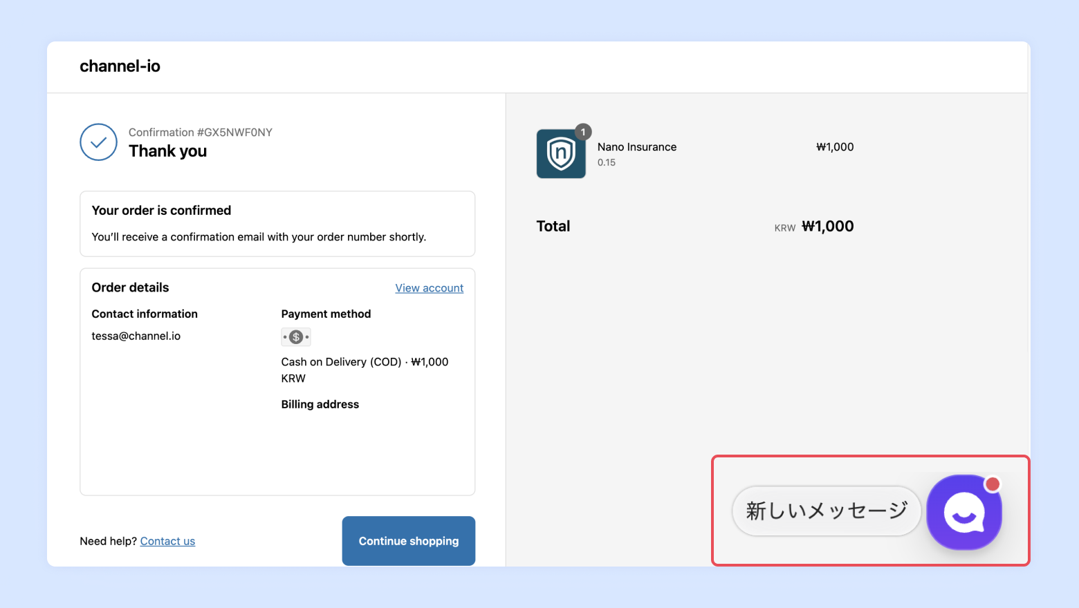CRMマーケティング配信時もShopifyの規定により、他のページとは異なり、ポップアップが表示されません。顧客がマーケティングメッセージを受け取ると「新しいメッセージ」という吹き出しのみが表示され、実際の内容はチャットアイコンをクリックして確認する必要があります。