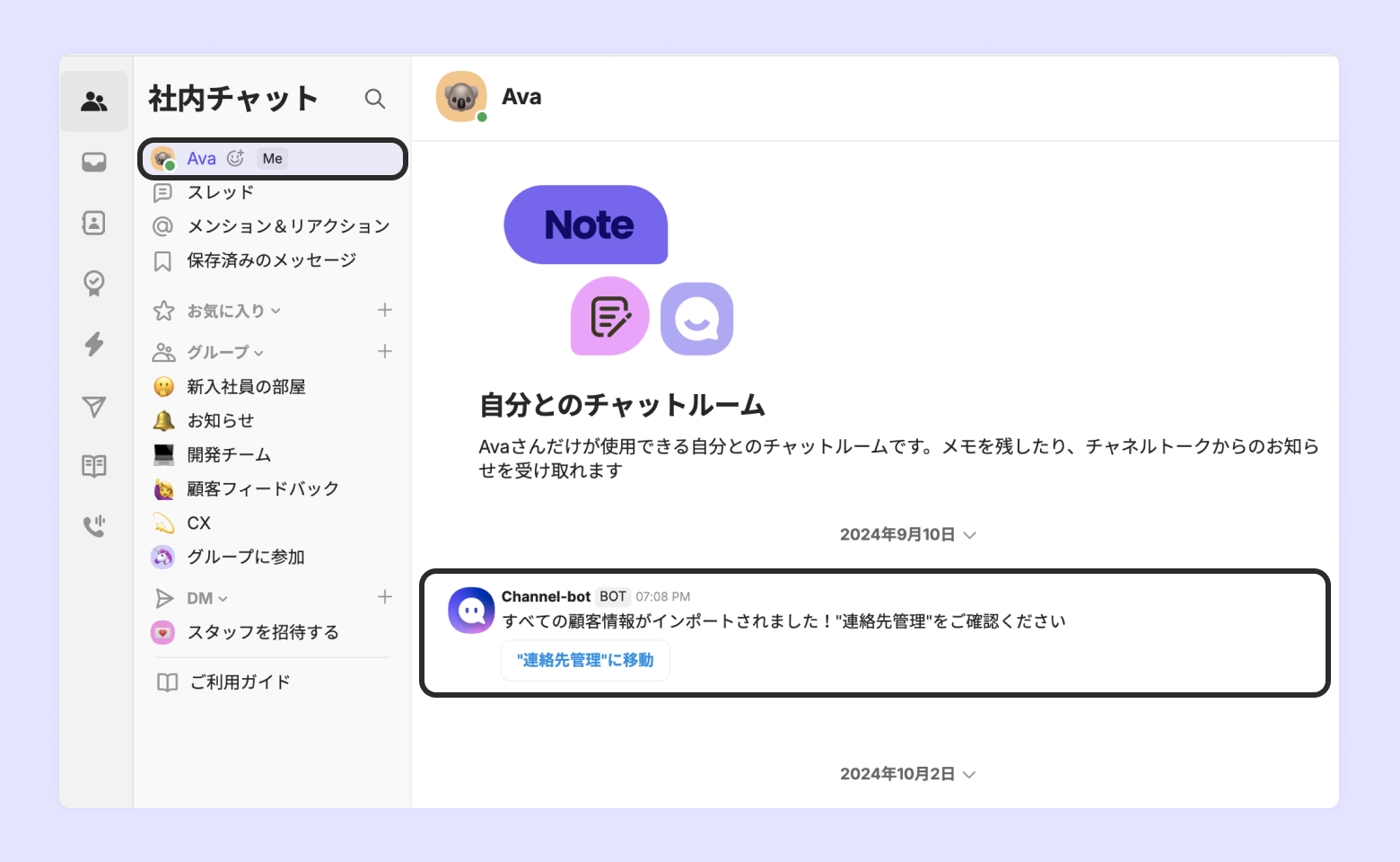 社内チャットの自分とのチャットルームにて、インポートが完了次第、通知します。