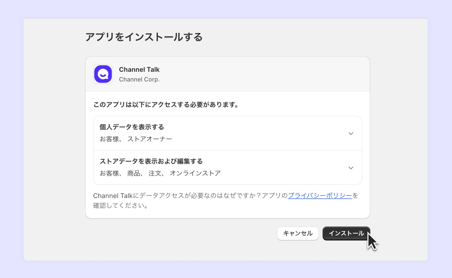 ページ遷移後、右下にある [インストール] をクリックします。