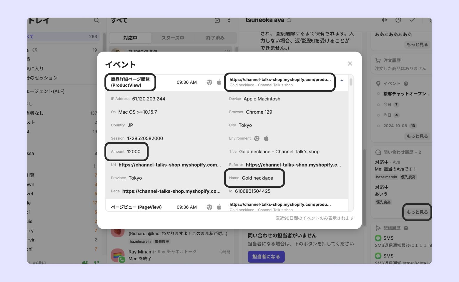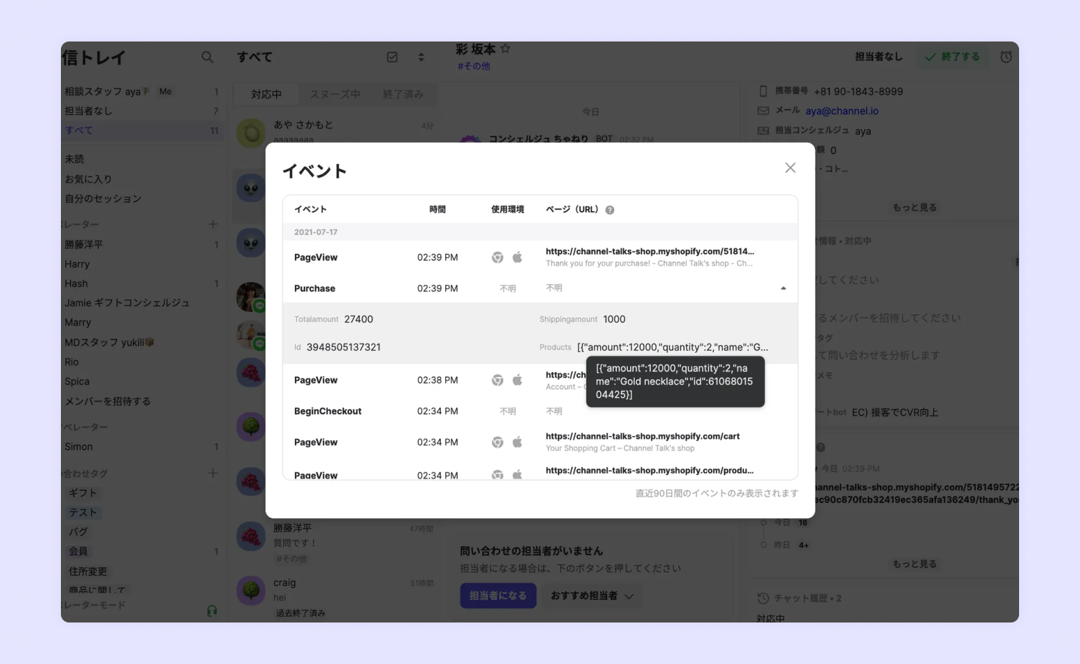 接客チャットでお問い合わせした顧客が今までどのページをご覧になっていたのか、どのページからチャットに流入したのか確認できる機能です。