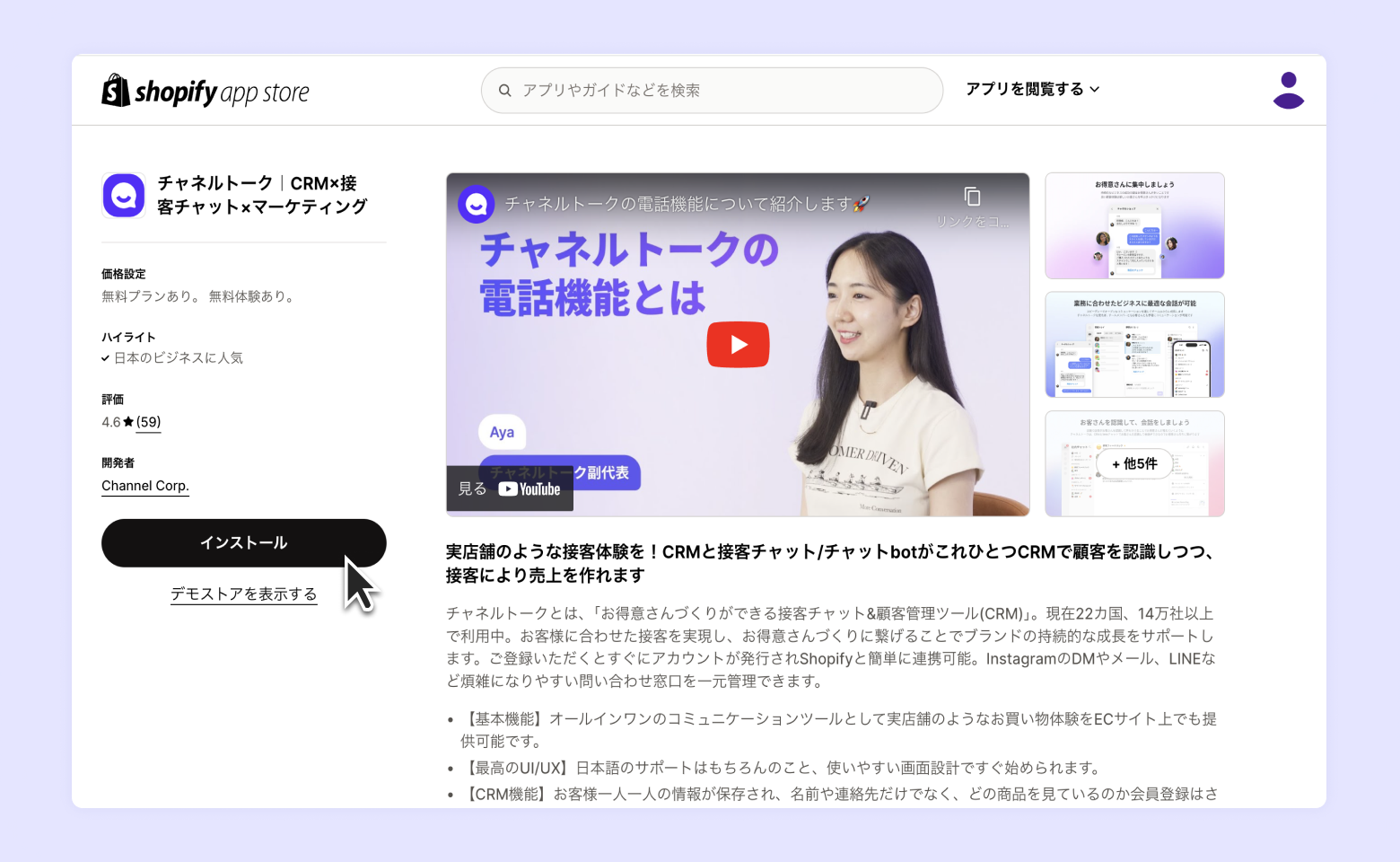 Shopify app storeで"チャネルトーク"を検索後、チャネルトーク Shopifyアプリページにて、チャネルトークのアプリを選択し、[インストール] をクリックします。