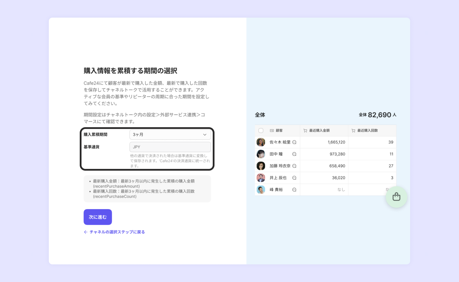 recentPurchaseCount | 最近購入回数 | デフォルト値は3ヶ月に指定 |