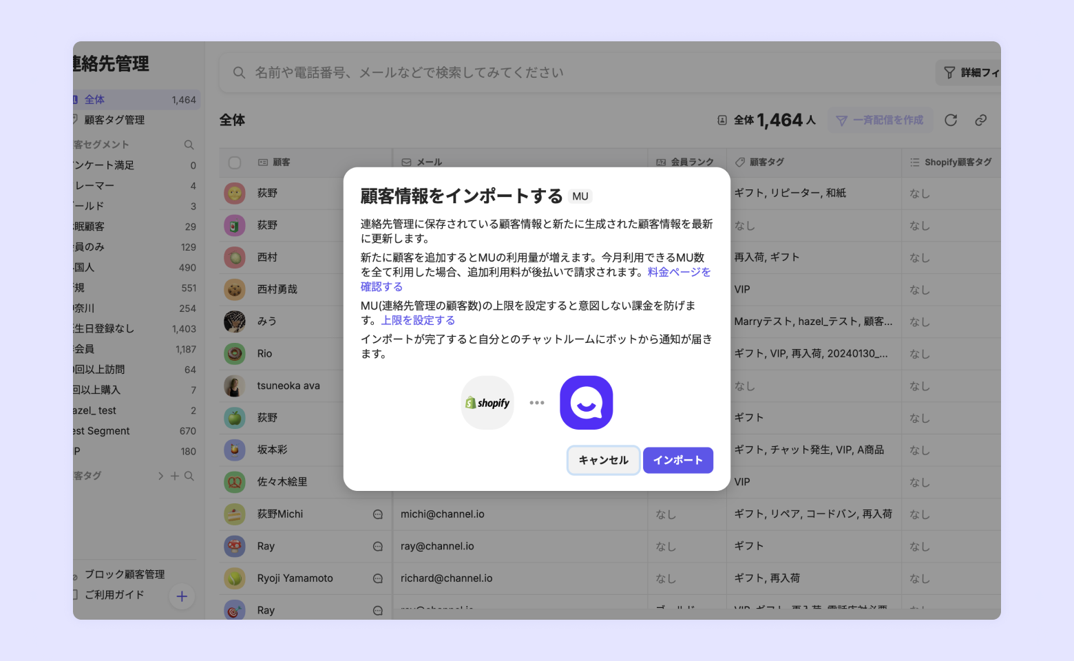 顧客情報インポートすると、MUがカウントされ利用分料金が請求されます。