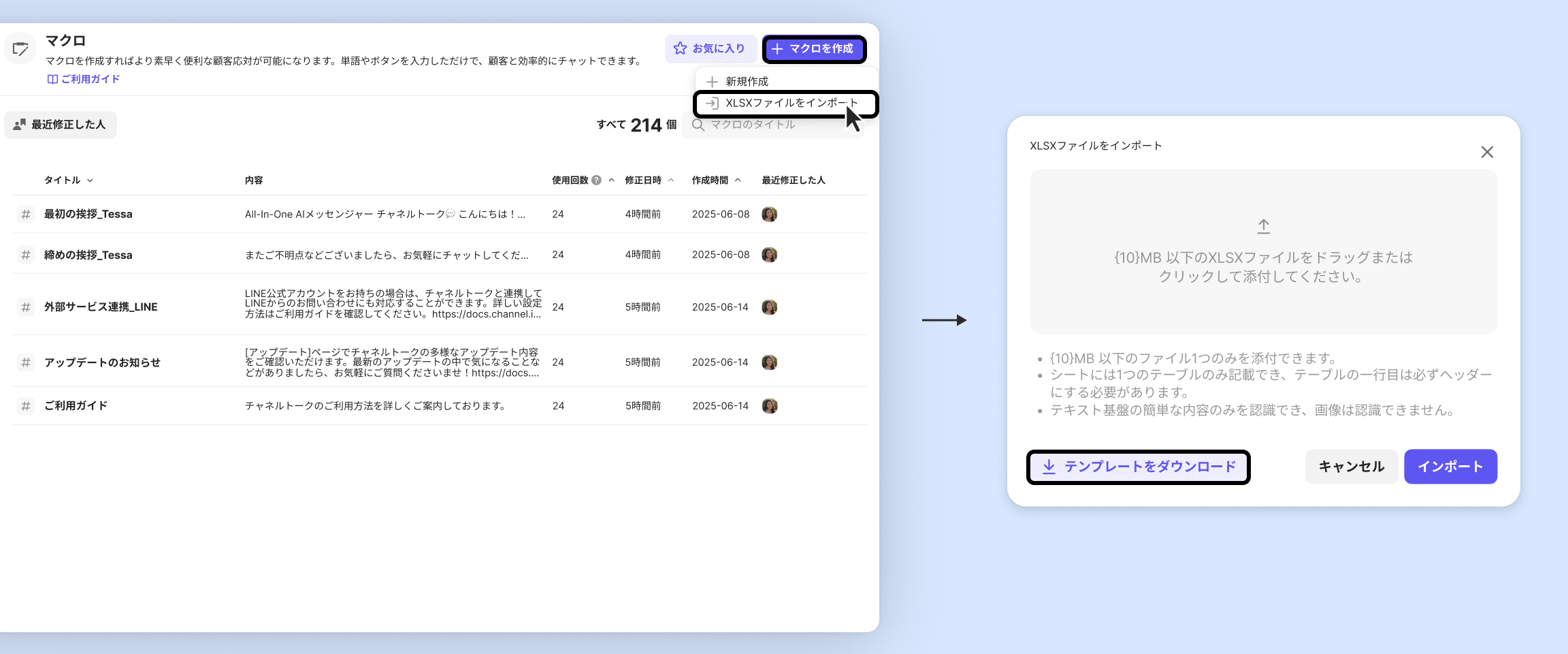 [チャネル設定] - [問い合わせ] - [マクロ] - [+マクロを作成] - [XLSXファイルをインポート] からファイルをアップロードし、[インポート] をクリックします。