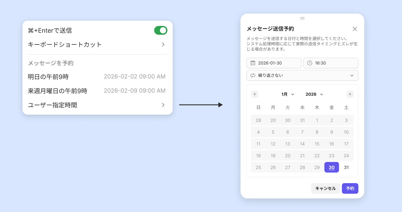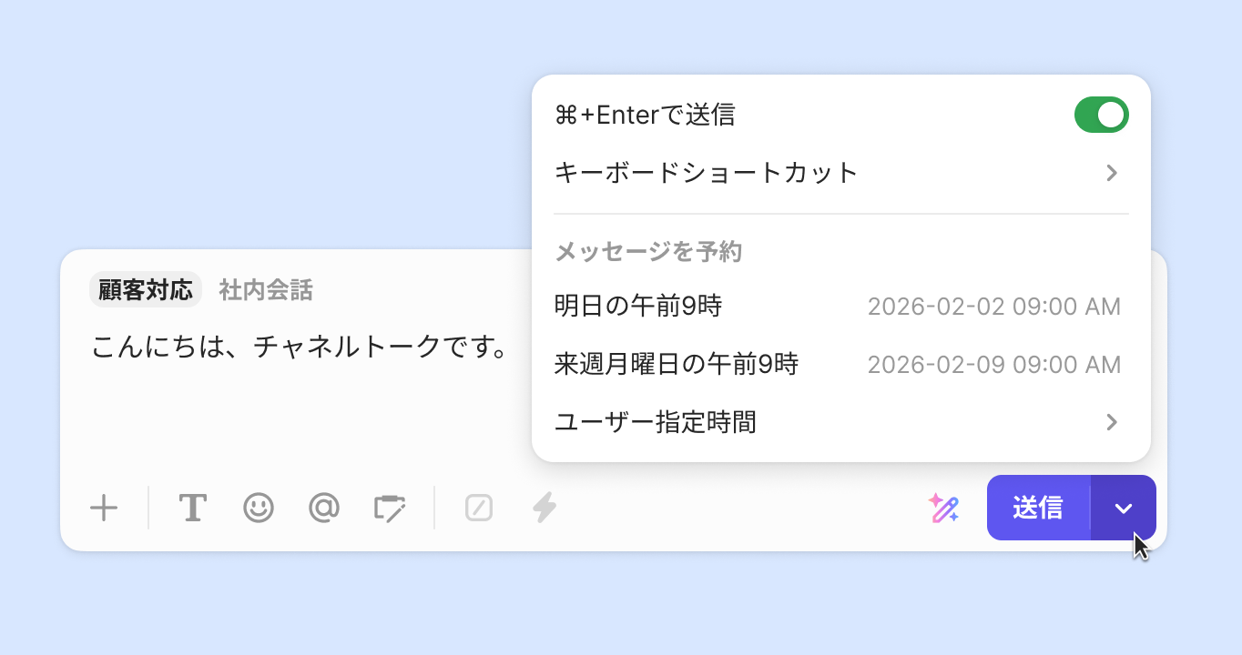 • メッセージ入力後、入力ウィンドウの右下にある予約アイコン(⏰)をクリックし、日時を選択すると送信予約ができます。