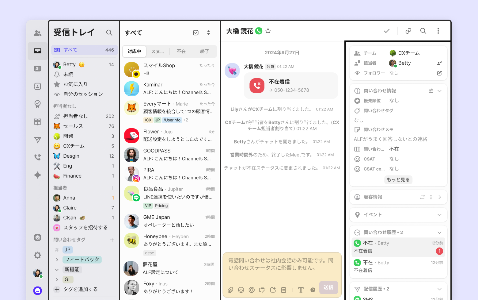 顧客と会話をする画面です。チャネルトークで送信する会話は、顧客対応と社内会話の2種類です 。