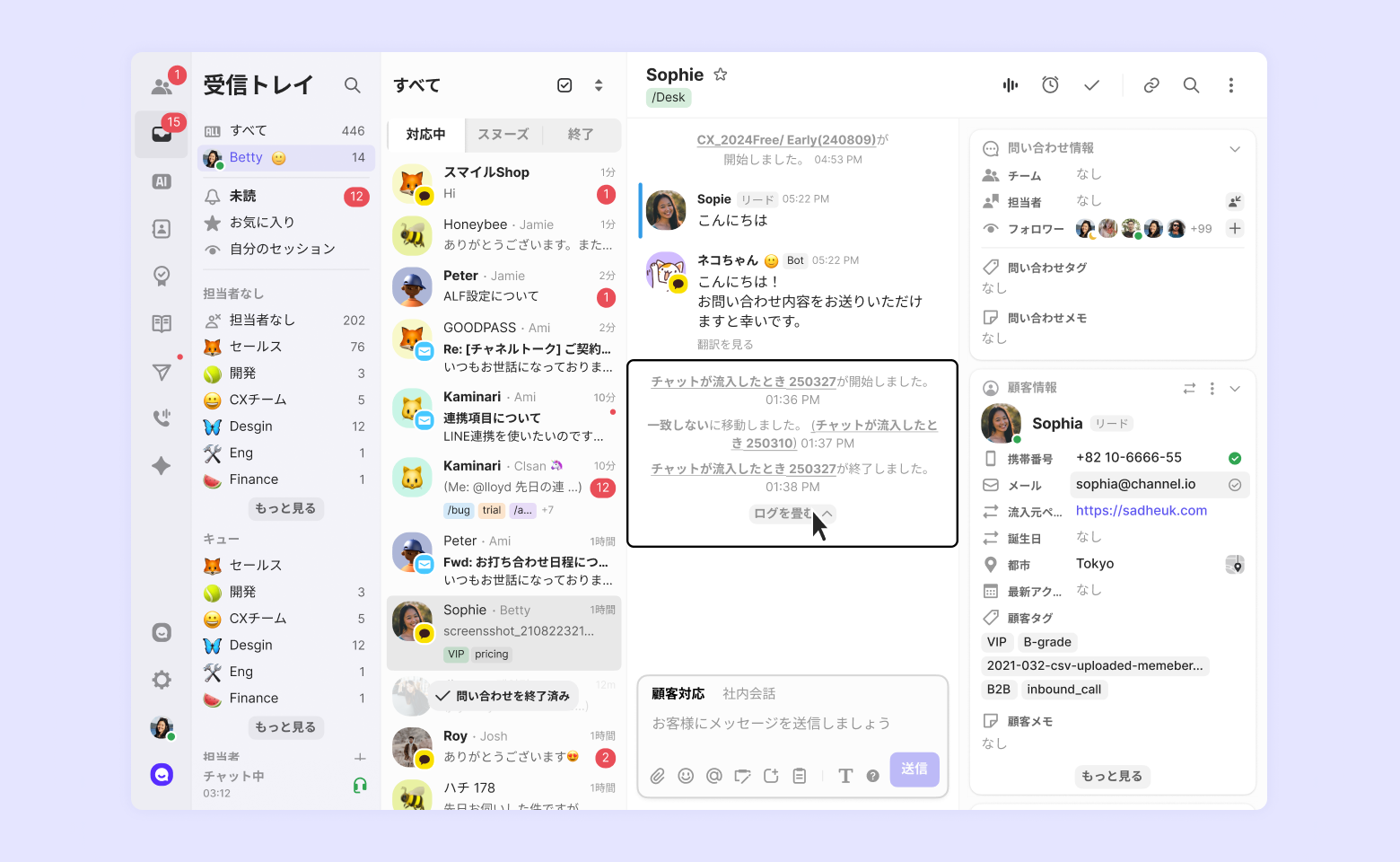 チャネルトーク、電話、メール、 Instagram DM、LINEから流入したチャットを分けて確認できます。
