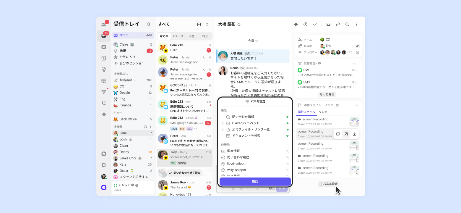 チームメンバーごとに異なるパネルレイアウトを保存することができ、チームメンバーに合わせて業務環境を構成できます。
