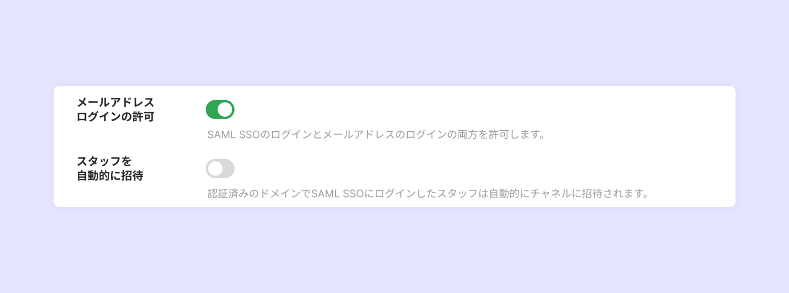 SAML SSOログイン方式と既存のメールアドレス+パスワード入力のログイン方式を一緒に利用できます。メールアドレスログインの許可を無効にすると、SAML SSOログインが設定されたチャネルへのアクセスができません。