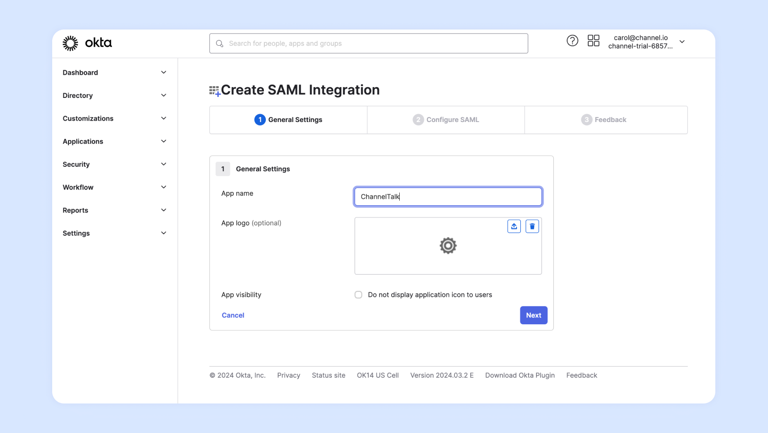 1. App nameで [ChannelTalk] を入力し、Nextをクリック