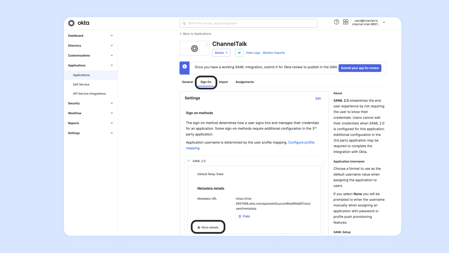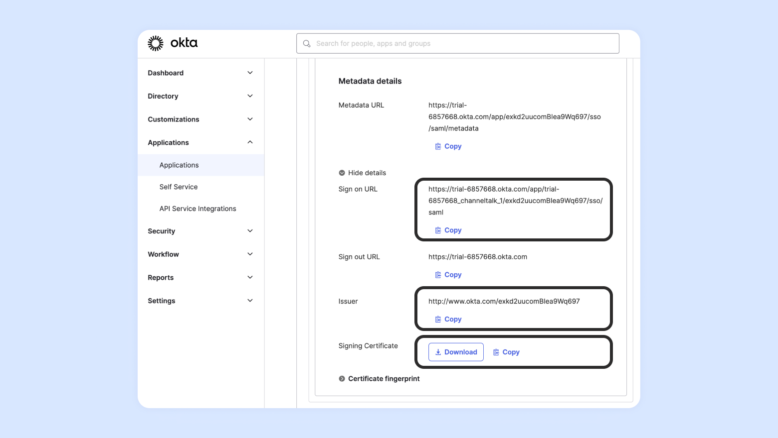 1. Sign on URL / Issuer / Signing Certificate をコピーし、チャネルトークのSAML SSO 設定画面に入力