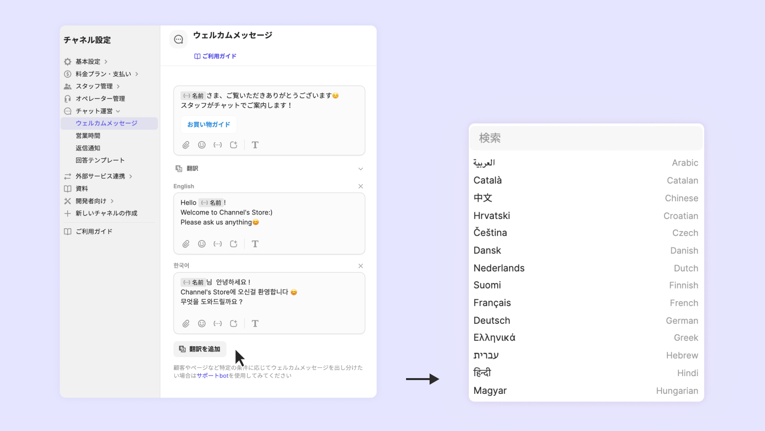 グローバルサービスを展開している場合、国別の言語でウェルカムメッセージを設定してみてください。日本語や英語だけでなく、より多くの国の言語を設定できます。(→多言語設定を見る)