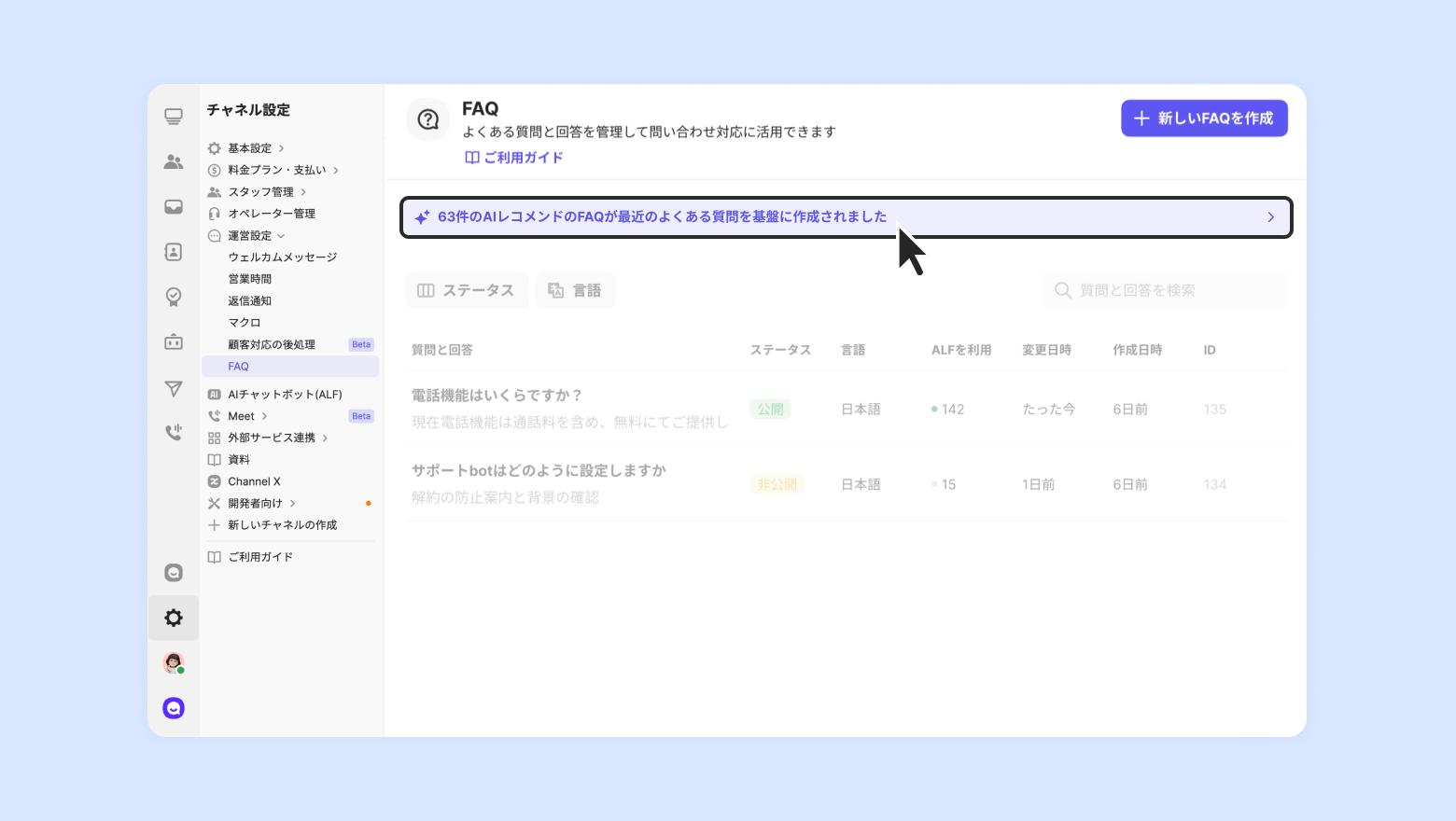 公開状態のFAQであれば、AIエージェント(ALF)を利用するかを設定できます。 (→ALFのガイドを確認する)