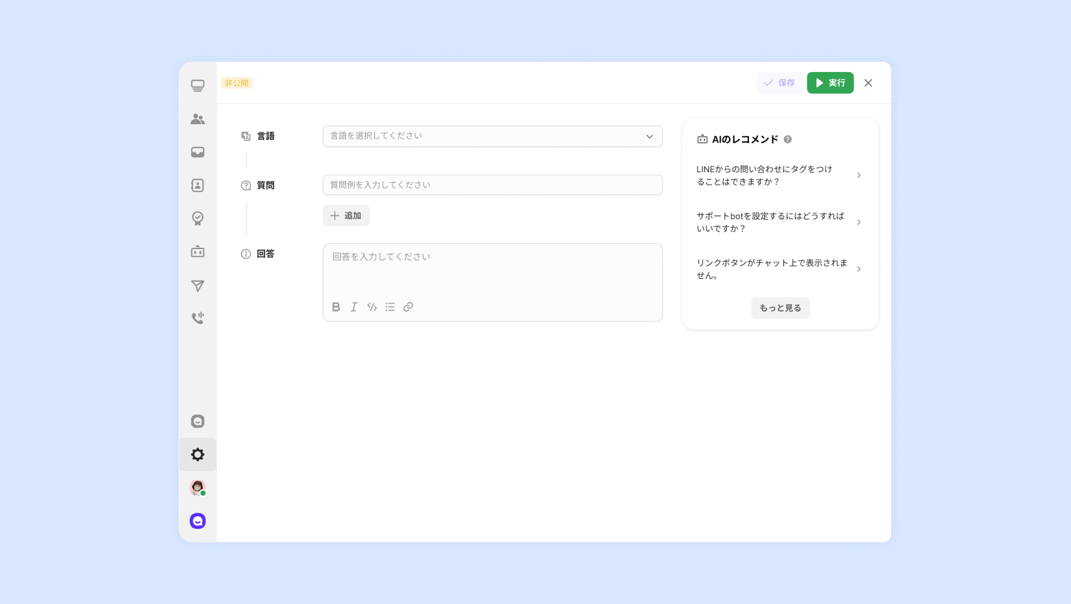 追加質問:顧客の多様な言い回しで質問をしてもマッチングできるように設定する質問です。最大10個まで登録できます。