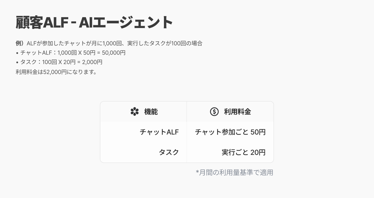 タスク:タスクは、顧客からよくされる依頼を、ALFが単純な質疑応答を超えて実際の業務まで処理できる新機能です。設定されたタスクのトリガー条件に従ってタスクが実行されると、課金が発生します。