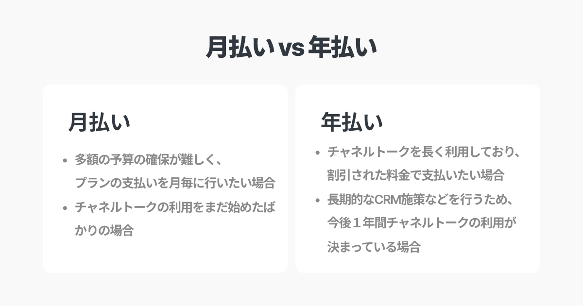 プランの月額払い/年額払い、利用量の先払い/後払いなど状況に合わせて支払い方法を変更できます。ビジネスの状況や利用状況に合わせて契約方法をお選びください。