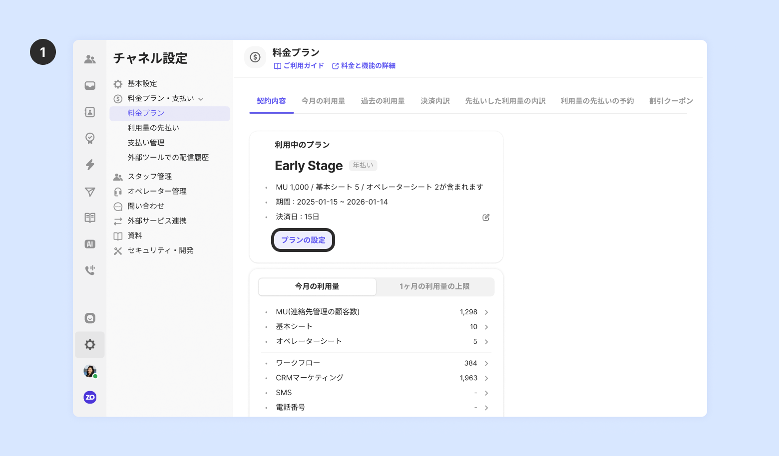 [チャネル設定] - [料金プラン・支払い] - [料金プラン] - [契約内容] で [プランの設定] をクリック