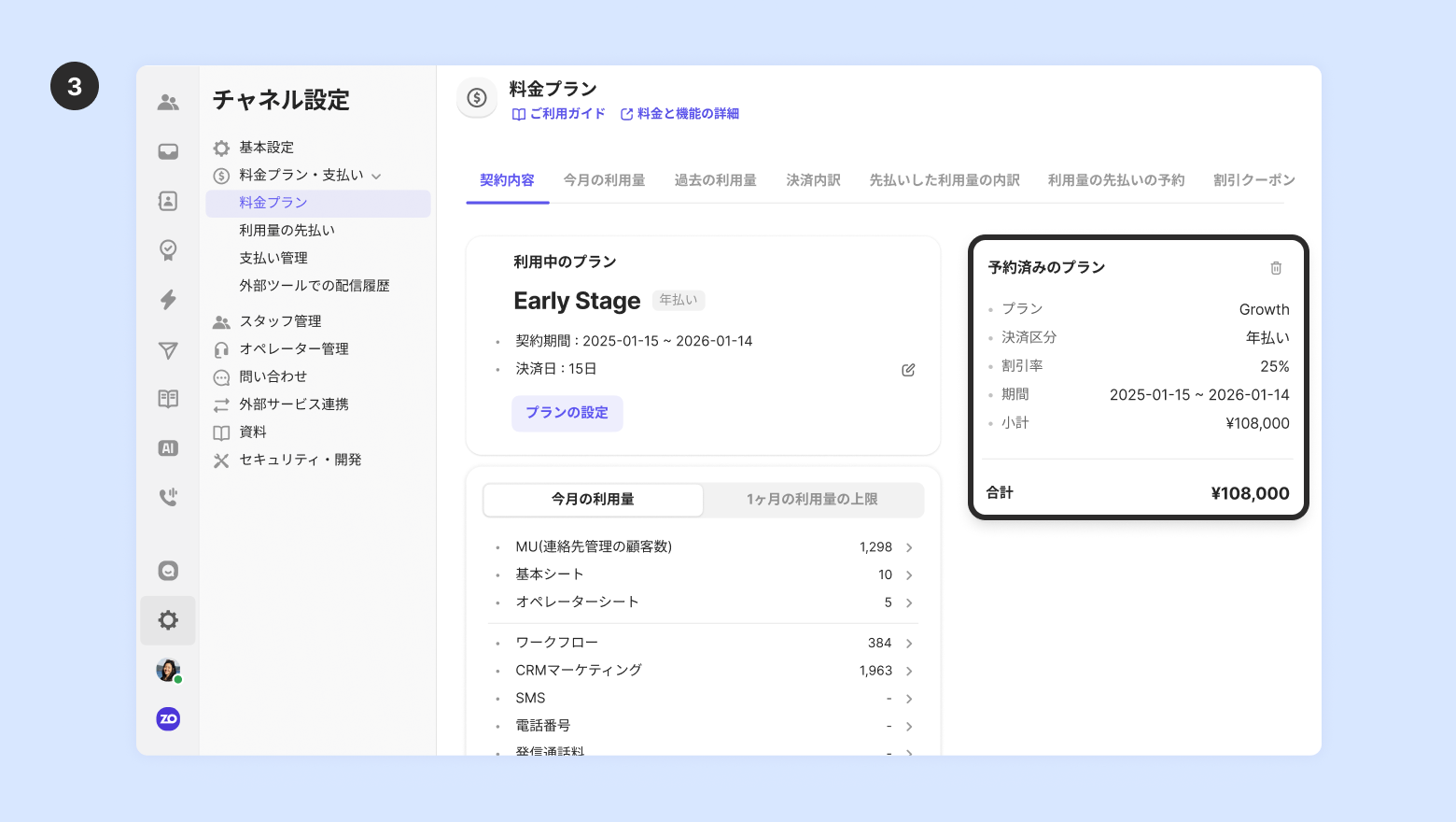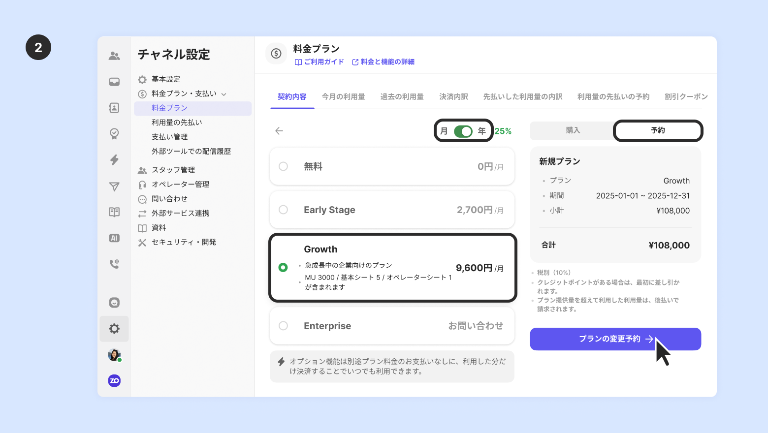 利用量の先払いの予約がある場合、利用量の先払いの予約は全て削除されます。[チャネル設定] - [料金プラン・支払い] - [利用量の先払い] で再度利用量の先払いを予約してください。