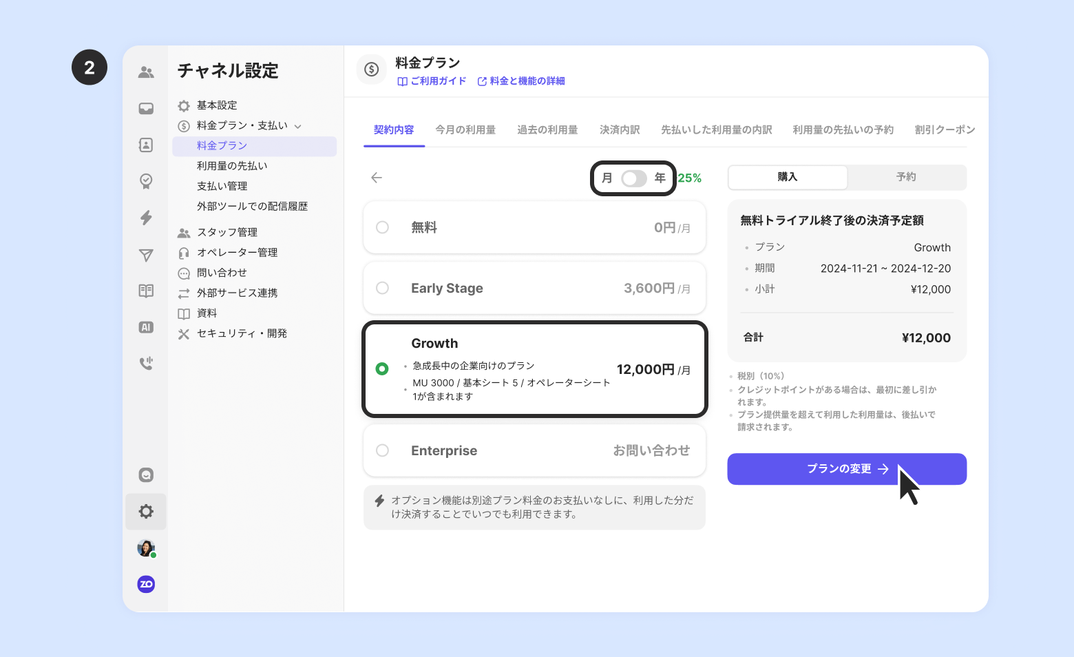 [チャネル設定] - [料金プラン・支払い] - [料金プラン] - [決済内容] をクリック 14日間の無料トライアルを完了していない場合は、[14日間の無料トライアルをする] をクリックします。